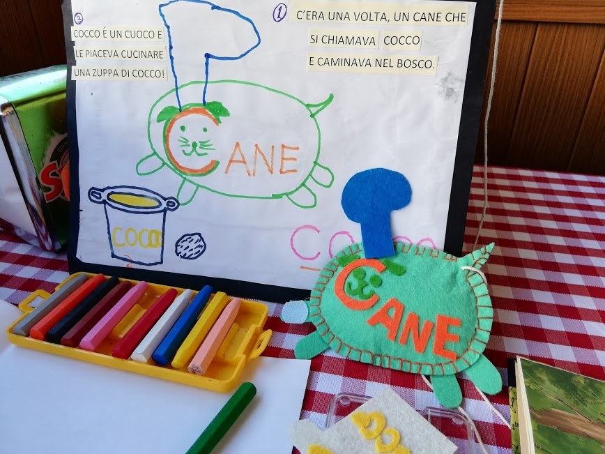 이탈리아 알파벳 "C"를 가지고 함께 이야기를 만들고, 그림을 만들며, 숫자를 세며 글자를 배워가는 과정과 그 결과물의 책과 인형인 개 "COCO"