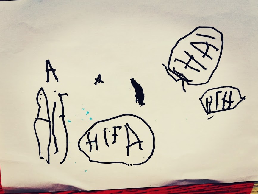 율이가 만 5살 때 Yellow Storn National Park의 검은 늑대에 대한 다큐멘터리를 보고 자기 방식으로 풀어낸 그림책을 동생들과 함께 보고 있다.