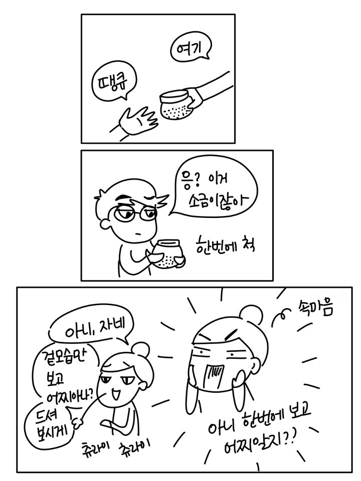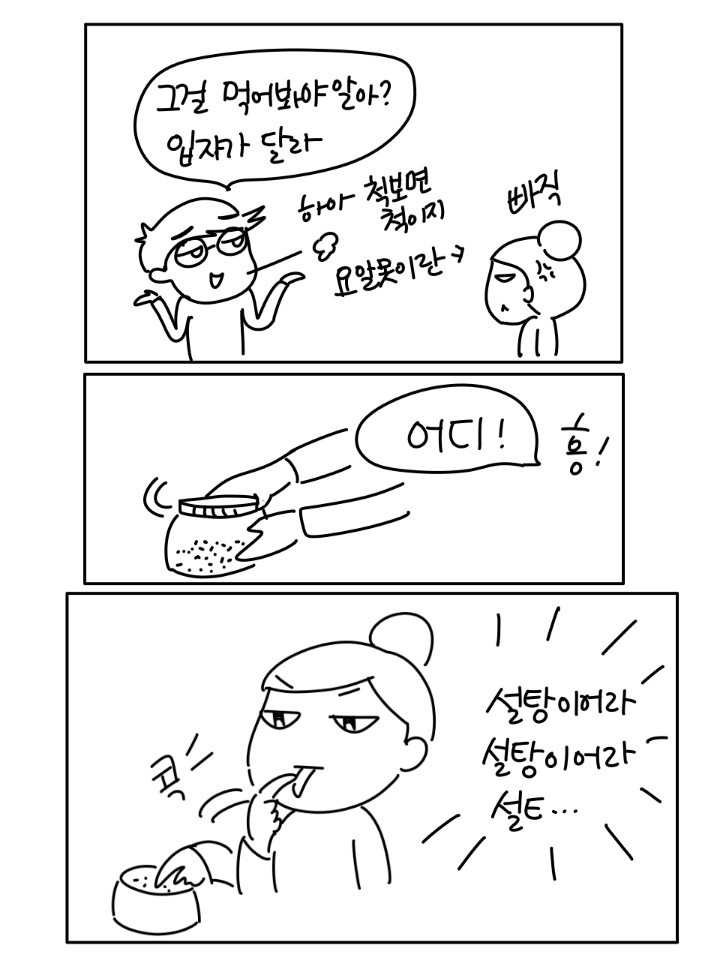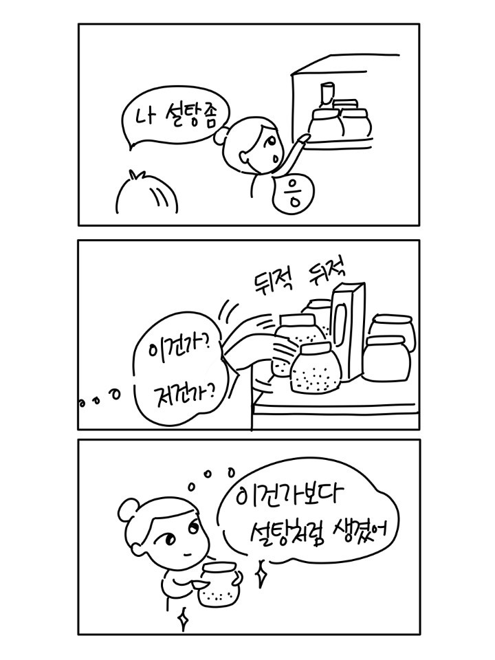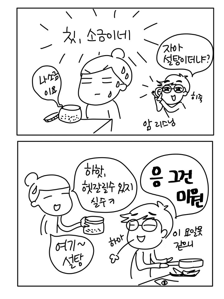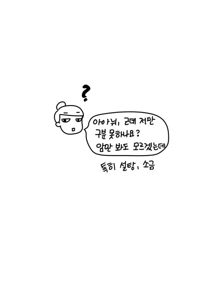 '소금은 무광, 설탕은 빛나고, 미원은 입자가 길어' 이보다 더 자세하고 확실한 설명이 어디에 있는가!!! 그래도 계속 실수하던 아내가 며칠 전 폭발했다.
