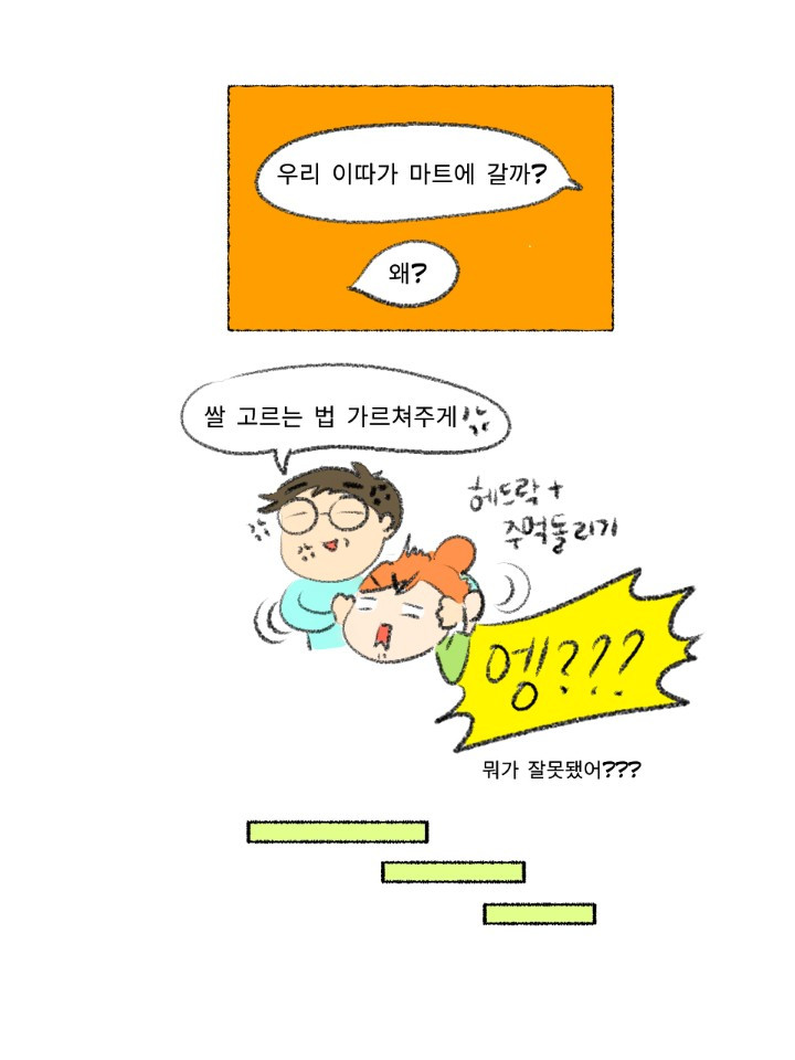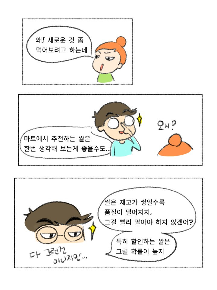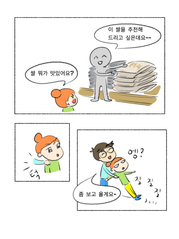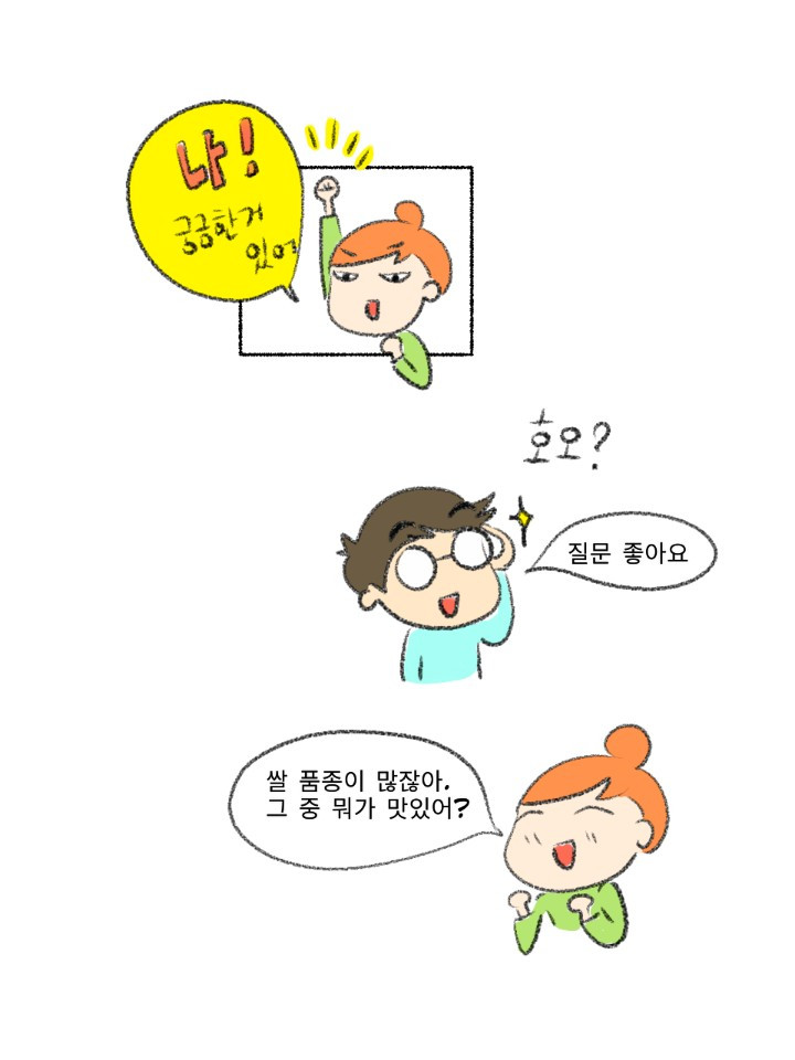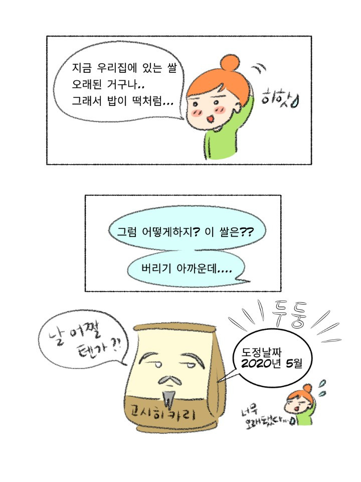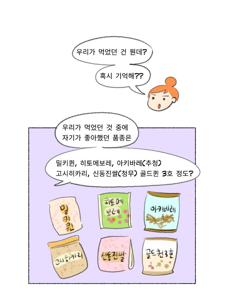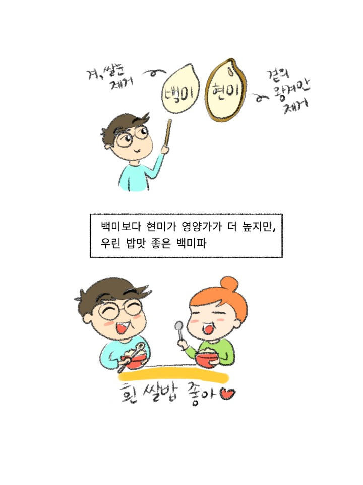 우선 이 시리즈의 기본 컨셉인 요알못에게 기본만 알려주기에 충실하게 쌀 고르는 법과 씻는 법 그리고 물 비율만 중점을 두고 그렸습니다. 아내가 늘 그렇듯 정말 잘그려줬구요. 그러다 늘 그렇듯 요거도, 조고도 넣고 싶다는 생각이 뜬금없이 들어서 잠깐 놔뒀는데 생각보다; 본업이 바빠서 두뇌가 돌지 않고 있습니다. 이러다가 아예 시리즈가 멈출 것 같아 우선 저지르고 수습하자는 마음으로 올리니 뭔가 부족해 보인다면 다 제탓입니다. 쌀은 언젠가 추가본이 나올 수도 있습니다.