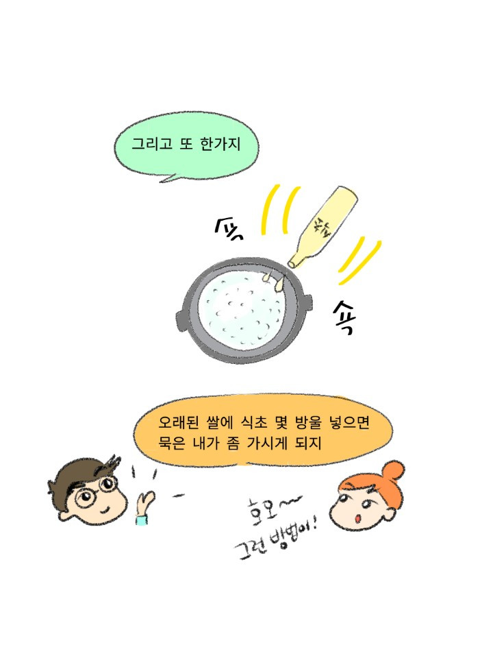 적당량의 식초를 넣고 밥을 하면 냄새는 사라지지만 여전히 뭔가 찝찝하죠. 떡을 해드시거나 술을 담그시는 것도 추천입니다. 가장 좋은 방법은 역시 고품질의 쌀을 빨리 먹는 거죠.