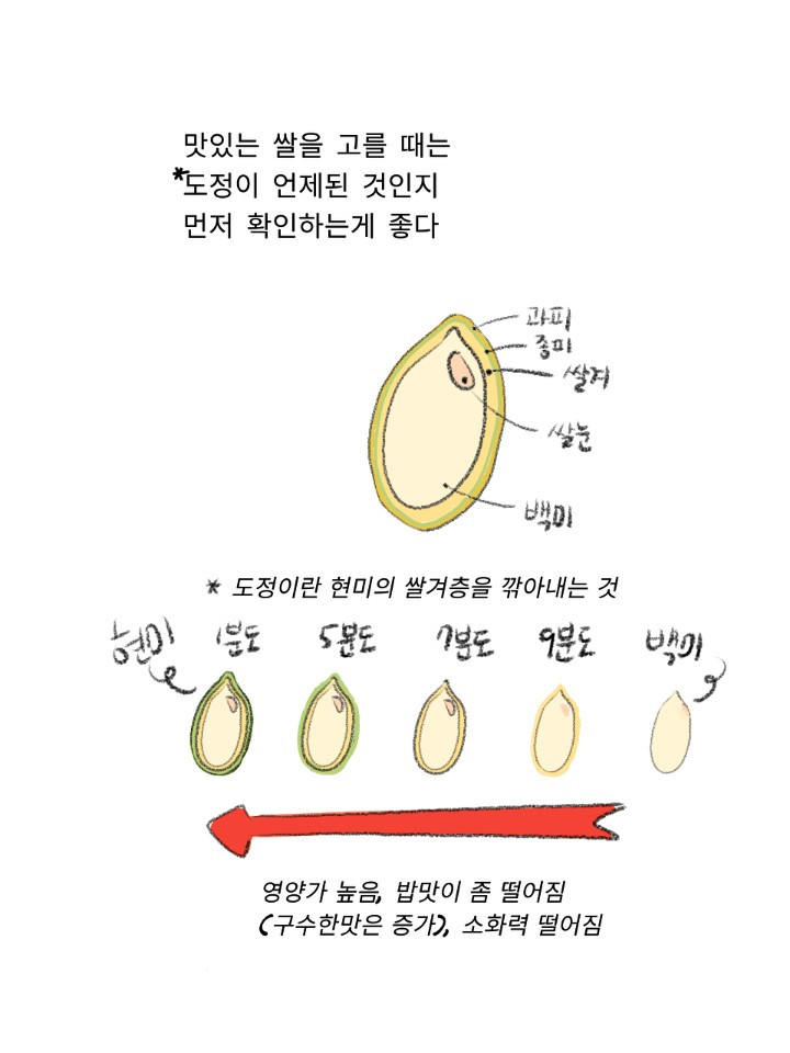1편과 2편의 연결고리인 떡이 된다는 표현이 오해를 줄 수 있을 것 같아서 조금 이야기를 더하겠습니다. 햅쌀은 수분함량이 높아서 물 비율을 그대로 잡거나 조금 많으면 진밥이 됩니다. 이것도 떡 된다는 표현을 씁니다. 도정일이 오래된 쌀은 현미를 깍아 백미가 되면서 겉표면이 노출이 되면서 지방질이 노화가 됩니다. 정확하게는 산화된다는 표현이 맞죠. 그리고 수분도 증발하면서 보관이 제대로 되지 않았다면 크랙이 생기고 부셔지기도 합니다. 이런 쌀로 밥을 하면 적은 수분 때문에 찰기가 사라지지만 노출된 지방질이 밥 짓는 과정에서 들러붙기도 합니다. 그림에서 표현된 떡이라는 표현은 이것을 의미합니다. 도정된 지 일년 가까이 된 쌀을 먹게 되면 종종 경험하게 되네요.
