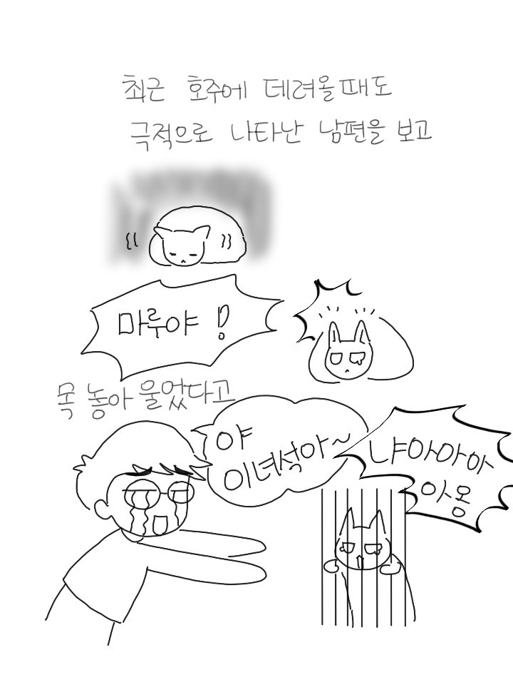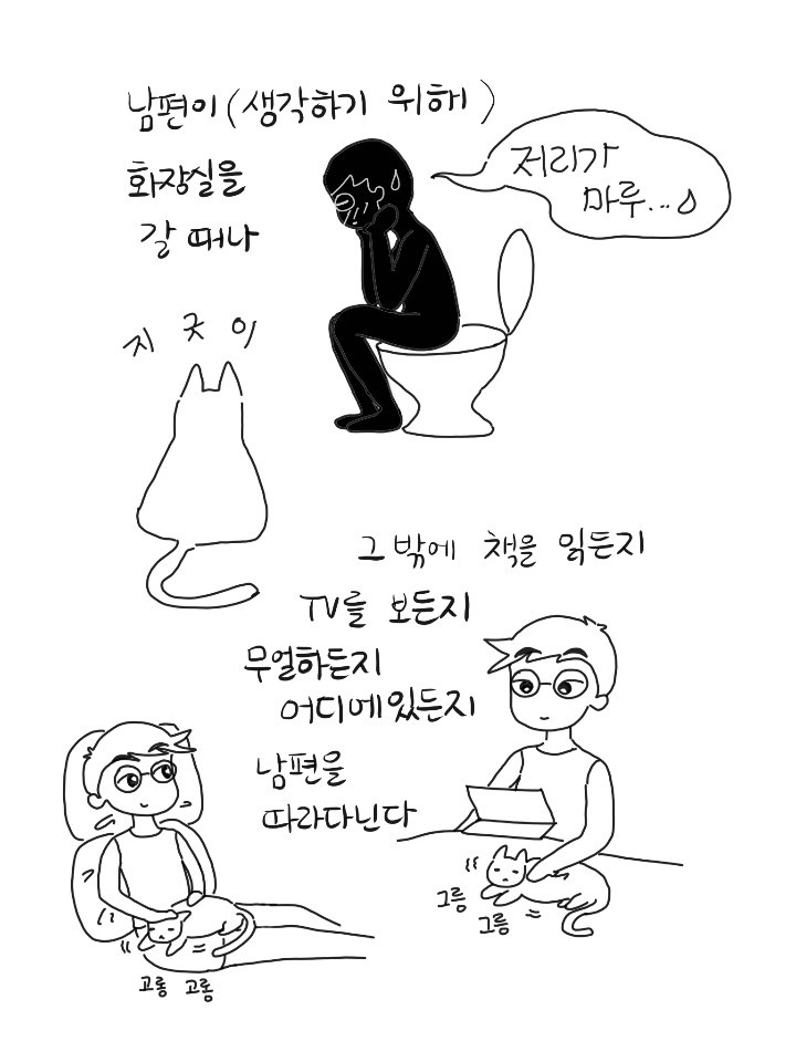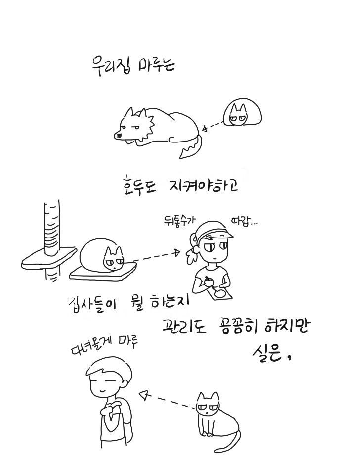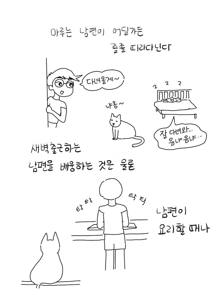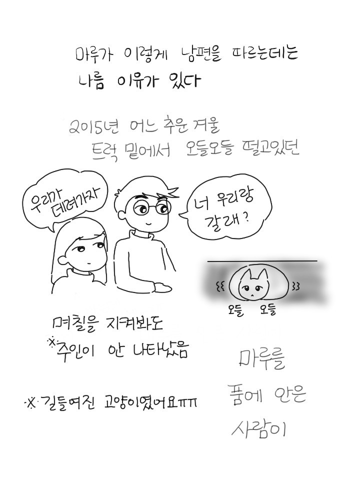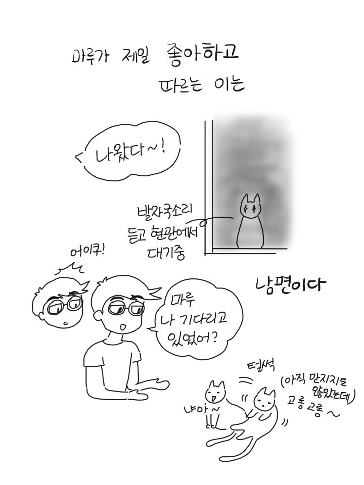 가끔 마루를 보고 있으니 그냥 눈물이 날 때가 있다. 인연인가 묘연인가. 추운 겨울 내가 데려온 게 아니라 인생 가장 추운 시기에 이 녀석이 날 안아주러 온 거 같기도 하다. 귀가길 문 앞, 화장실 앞, 부엌 옆, 침대 위. 오늘도 그렇게 서로를 찾는다.