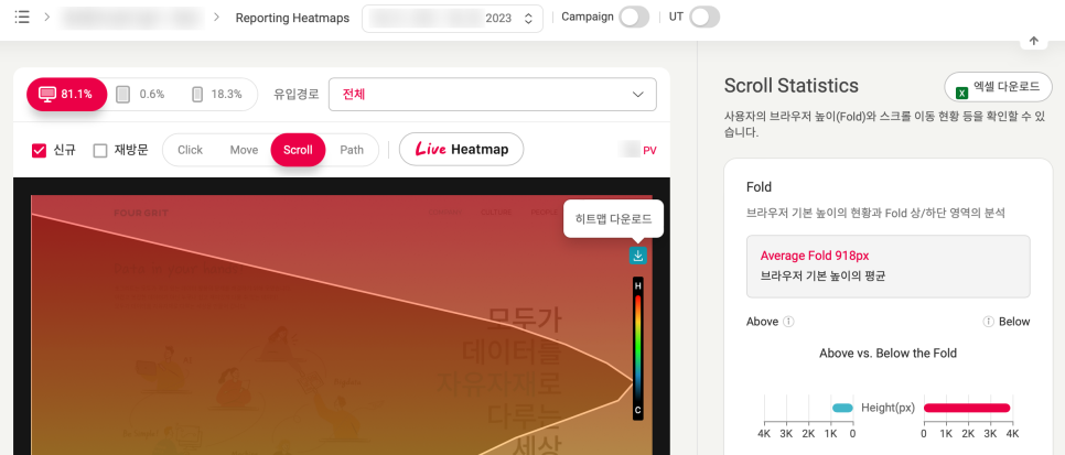 메인은 가장 첫 번째 랜딩 영역이라서 제외, 서비스 소개 부분에 그래프가 우측으로 튀어나오는 부분이 집중도가 높은 구간이다. 신규 방문자는 처음 방문했기에 서비스 소개 영역에 주목도가 높고, 재방문자는 해당 페이지를 이미 봤던 유저이기 때문에 2번째 영역인 회사소개가 바뀐 사항이 없기 때문에 이탈이 일어나 도달률이 50%까지 빠지는 수치를 볼 수 있다.