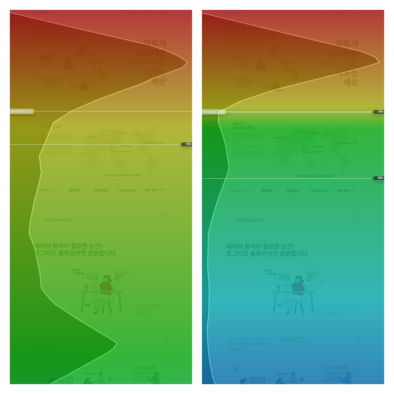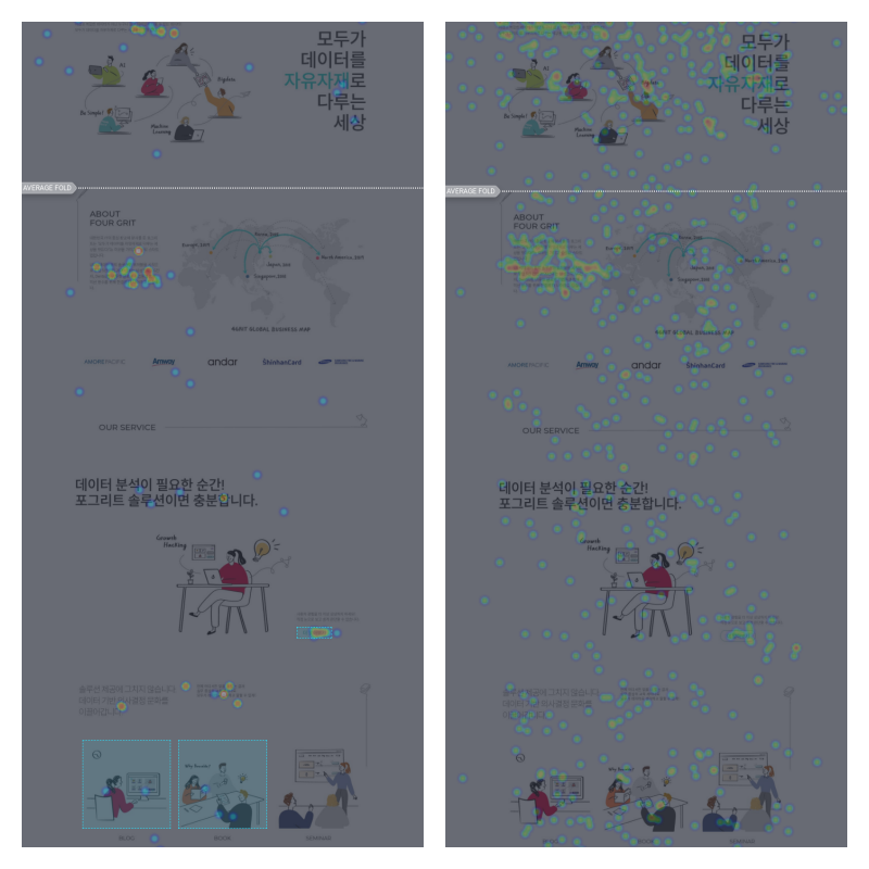 버튼은 아니지만 무브 영역에서 관심도 있게 보는 영역을 확인하여 좀 더 강조하는 콘텐츠로 구성할 수도 있다. 포그리트 회사 소개 영역에 어떤 기업들이 사용하고 있는지 빨간색 영역으로 진하다면, 어떤 기업들이 사용하고 있는지 보여주는 신뢰도 지표나 로고로 변경해 보는 것도 고려할 수 있다.