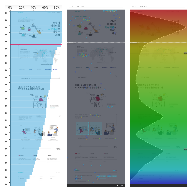 히트맵을 보면서 어디에서 이탈이 일어나는지 페이지 전체 픽셀(depth)에서 이탈률이 높은 구간을 파악한다. 기획 구성은 크게 메인 > 회사소개 > 서비스 소개 > 최근 뉴스 > 푸터 순으로 이어진다.