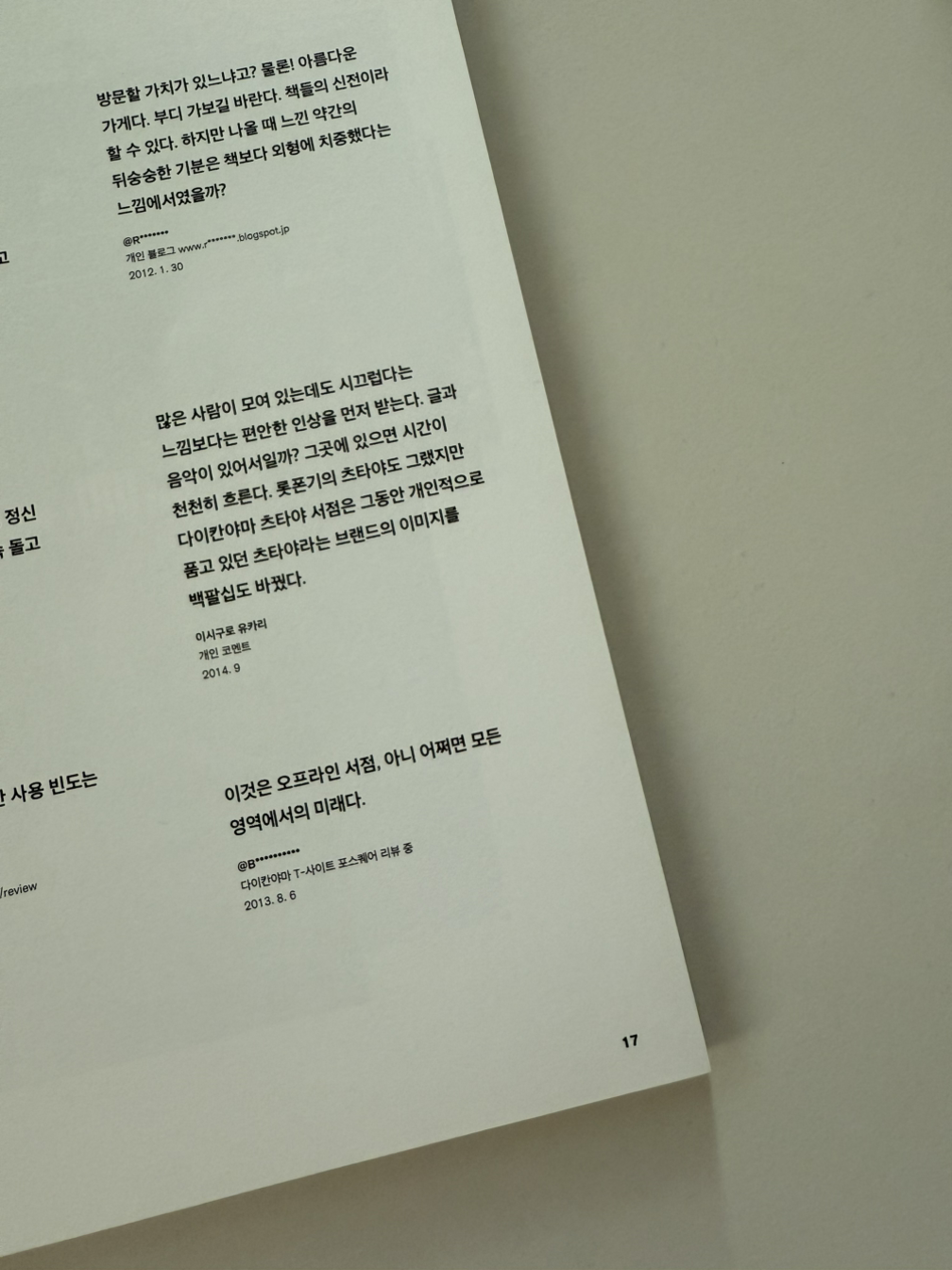 - 특화된 카테고리 : 츠타의 서점은 제안을 한다. 음반은 아카데믹한 성격이라면 서적 분야는 감성적 접근법을 선택한다.