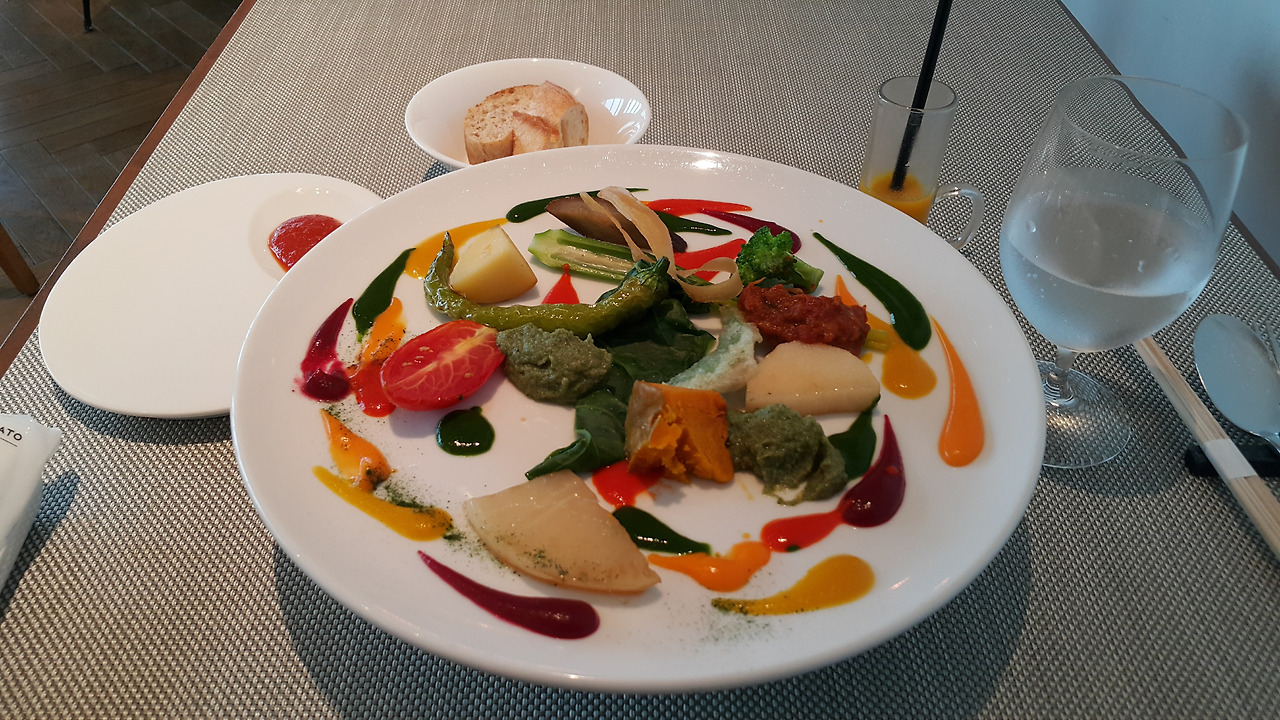 그랜드프론트오사카안에 있는 프렌치 레스토랑 뤼미에르 오사카 KARATO. 일본은 쇼핑몰안 식당가에도 훌륭한 레스토랑들이 많다. 입구에서 가이드북 하나 챙겨서 마음에 드는 음식을 먹어보면 대부분 중간이상. 그중 발견한곳이다. 건강한 야채요리이니 만큼 간은 심심하지만 재료 본연에 맛이 살아있다. 모니모니해도 컬러풀 플레이팅이 예술이다. 다먹고 난 접시가 아름다울수 있다는 걸 알게된 식당이다. 컬러포인트가 있는 투명하고 깔끔한 공간에서 프렌치음식은 꽤 괜찮은 경험이다. 여성들의 비율이 압도적으로 많은곳.