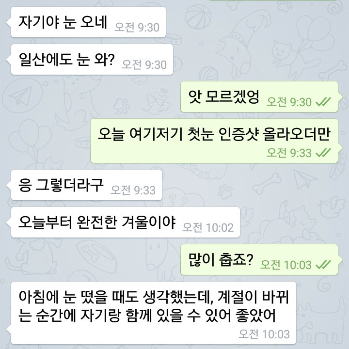 올해 첫눈을 만났는데 ‘눈 온다’고 문자를 보낼 사람이 없다. 그게 또 서러워졌다. 메신저 창을 조금 뒤적거리다가 엄마와 동생에게 눈이 내린 북한산 전경을 보냈다. “너무 멋진데.” “예쁘네.” 원하는 답이 아니다. 또 다시 메신저를 뒤적이다가 시아빠에게 전화를 걸었다. 무슨 일 있냐는 시아빠에게 눈이 온다고, 혼자 보기 너무 아깝다고 말하다가 울어버렸다. 그 말이 무슨 뜻인지 바로 알아차린 그는 내게 “울고 싶을 때 울되 너무 많이 울지는 말거라. 환희가 너무 가슴 아플 거야. 우리 며느리는 씩씩하니까 잘 이겨내리라 믿는다. 미안하고 고맙고 사랑한다”고 대답해주었다. 이번에는 내가 원하던 답이었나 보다. 그 말을 듣자마자 조금 더 울었다.