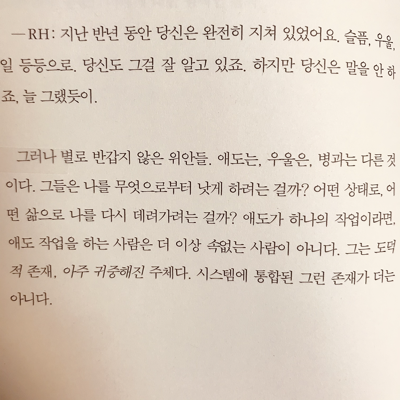 종종 낯모르는 이들로부터 다이렉트 메시지를 받는다. 대부분 질병을 앓고 있는 가족과 함께하는 이들이 보낸 것이다. 그들은 자신의 상황을 고백하며 내게 조언을 구한다. 나도 애도 중인데 그 진지한 메시지에 뭐라고 답변해야 하나 싶다가도 어떤 마음으로 연락했을지 너무 잘 아니까 쉽게 무시하기도 어렵다. 나는 그저 그들이 애도의 시간을 잘 견디기를 빌면서 내게 위로가 되었던 말들을 돌려준다. “괜찮지 않아도 괜찮아요”, “울고 싶을 때는 울어도 돼요”, “여기서 50년이 거기에서는 5분이래요” 같은 것들.
