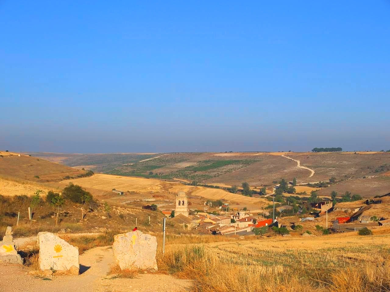 길을 걷기 시작한지 이십일이 되어간다. 약간의 불면증과 새벽에 잠들던 습관이 이곳에 와서는 사라졌다. 새벽에 자고 낮에 일어나는게 크게 불편하지는 않았지만, 새벽까지 깨어있다보면 내 감정에 빠져버리기나, 너무 많은 생각 속에서 허우적거리거나, 우울해지기 쉽다. 여기서는 더운 날씨 때문에라도 일찍 일어나 걷기 때문에 일찍 잠든다. 오후 한두시가 넘으면 걷는게 거의 불가능할 정도로 햇볕이 뜨겁다. 처음 며칠은 일찍 일어나기가 어찌나 어렵던지. 그런데 오늘은 5시반에 저절로 눈이 떠졌다. 무슨 일이든 습관이 되기까지는 이주정도의 시간이 걸린다는 말이 맞는 모양이다. 메세타 고원지대, 이곳은 밀밭이 끝도 없이 펼쳐지는 언덕과 평야로 이루어진 곳이다. 해발 700-800미터 정도 되는 높이에 끝없이 펼쳐지는 땅. 지금은 한여름인데도, 풍경은 한국의 가을 들녘 같다. 추수를 이미 끝낸 황금색 밀밭이 광활하게 펼쳐진다. 그 사이사이 노랑, 연두, 녹색의 해바라기 밭으로 더 알록달록해진다. 뜨거운 햇살과 가을 풍경이 묘하게 어우러진다. 익숙한듯 익숙하지 않은 풍경이다. 한국의 농촌처럼 시골집들은 보이지 않는다. 그저 자연 속에서 저절로 가꾸어진듯한 들녘과 꽃밭. 그 사이에 길고 가늘게 난 길을 따라 몇시간째 걷고 있다.