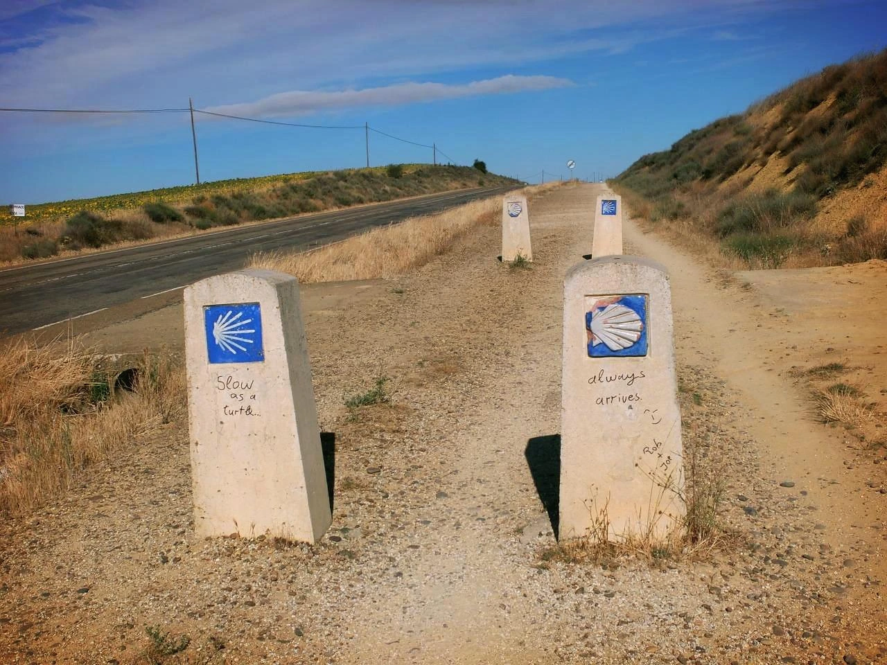 순례자길을 안내하는 이정표는 다양하다. 비석처럼 세워진 돌에 파랑과 노랑의 순례자 사인이 박혀있기도 하고, 자동차 도로 사인처럼 큰 표지판이 세워져 있기도 하고, 작은 노란 화살표가 벽에 그려져 있기도 하고, 나무판자 위에 새겨져 있기도 하고. 헤깔리는 지점에서는 앞서 걸은 순레자들이 돌이나 나뭇가지로 화살표를 만들어 놓기도 한다. 오늘 마주친 순례자 비석 위에 누군가 적어놓은 글귀다.