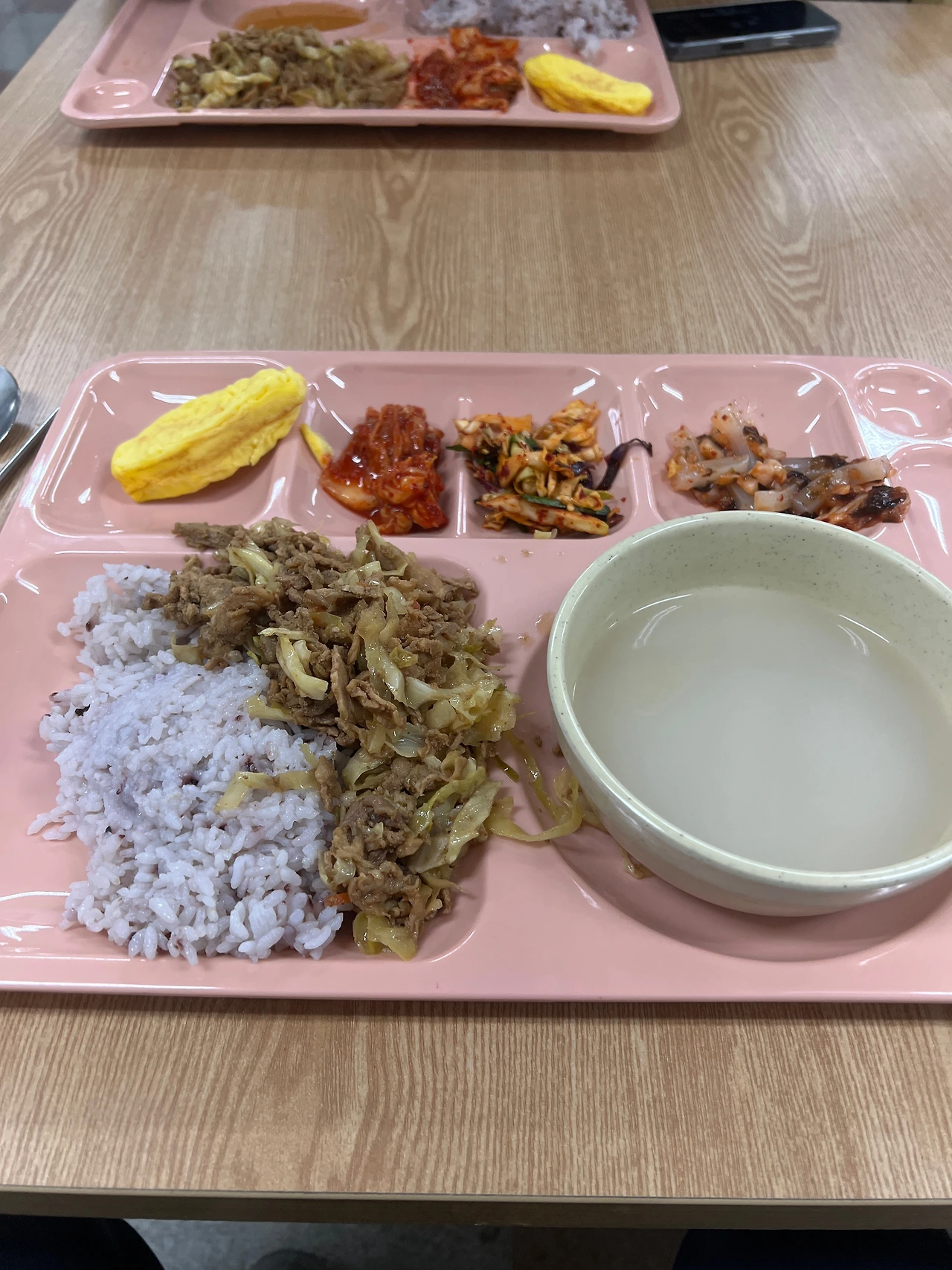 오후 2시에 되어 점심 식사 시간을 가졌다. 벌써 2시라고??? 딱히 대단한 일을 한 것 같지도 않은데. 게다가 1시간이나 휴식시간이 부여된다. 2층 식당에 가서 셀프 배식을 한다. 아무 맛도 나지 않았지만, 무료로 끼니를 해결할 수 있다는 것에 만족한다.