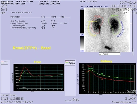 오른쪽 콩팥은 9분 만에 수치가 절반이 되었고 왼쪽은 15분 만에 절반이 됐어요. 속도 차이가 있지만 정상 범위입니다. 이제 제 얼굴 안 보셔도 됩니다.