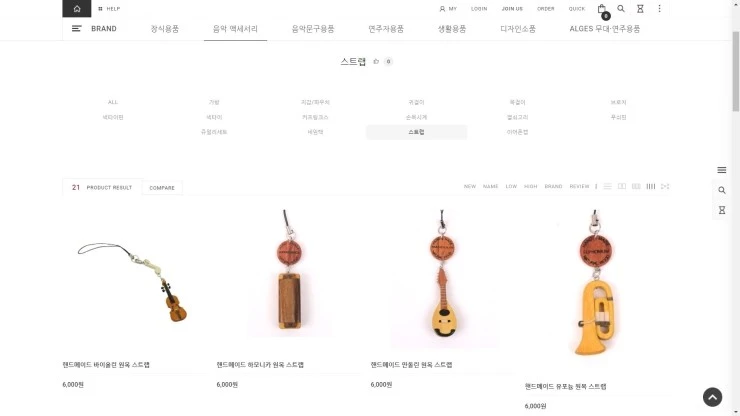홈페이지 화면입니다. 여러 종류의 악기 모양 스트랩이 있습니다.