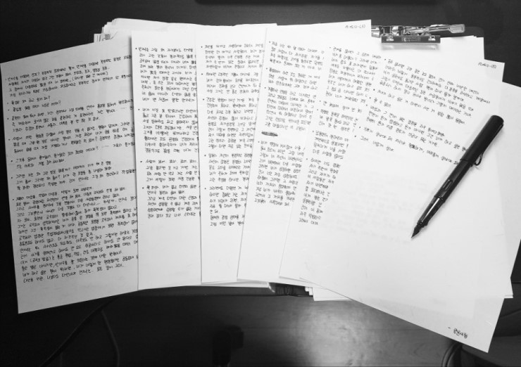 목적에 따라서 펜을 달리 쓰는 첫 번째 이유. 글씨를 '빨리 잘' 쓴다면 상관없을지도 모르겠습니다. 필사든 생각을 옮겨 적는 일이든 조용한 환경에서 시간을 오래 들입니다. 나머지 환경에선, 이를테면 메모하거나 회의 내용을 적거나 필기할 때면 빨리 쓰는 게 중요하죠. 예쁘게 쓴다기보다는 알아볼 수 있을 정도로만 빠르게요. 그러면 글씨를 개발새발 쓰게 됩니다. 고치려고 했지만 잘 되지 않았고, 결국 방법을 바꿨습니다. 일단 흘려 쓰고 나중에 목적에 맞게 정돈해서 옮겨 적는 것으로요. 일을 두 번하는 셈이죠. 그러다 보니 암만 조용한 곳에서 차분히 눌러쓴다고 한들, 평소에 급하게 휘갈겨 쓰던 펜으로는 잘 쓰려야 잘 쓸 수가 없었습니다. 그래서 사적인 영역과 공적인 영역에서 쓸 펜을 각각 다르게 하는 것입니다. 사적인 영역은 글 쓸 때이고 공적인 영역은 나머지 환경에 해당합니다.