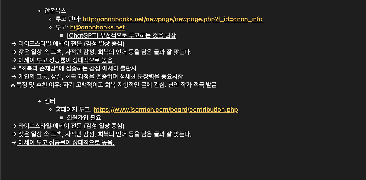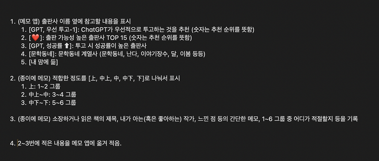 이제 추린 목록에 우선순위를 정할 차례입니다. 바로 정하는 건 아니고, 약간의 준비가 필요합니다. 전 이때 ChatGPT를 활용했습니다. 제 원고를 보여 준 뒤에 제가 정리한 텍스트(출판사 정보와 이와 관련해 메모한 내용)를 붙여 넣으니 출판사별 특징이나 제 글과의 적합성 여부 등을 알려 줬습니다.