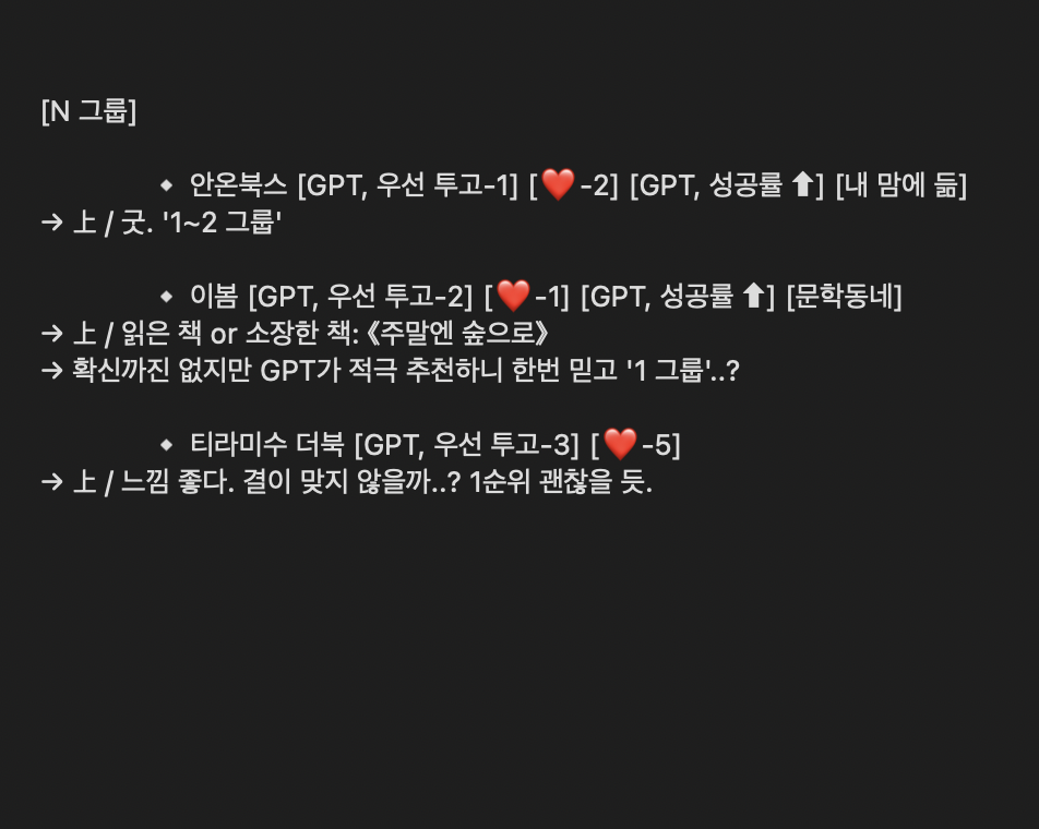 이 내용을 바탕으로 그룹을 나눴습니다. 1그룹이 가장 먼저 채워졌고, 그다음으로 6그룹에서 2~3개를 추가함으로써 마저 채웠습니다. 나머지는 다시 교보문고의 출판사에 이름을 검색하면서 결정했구요.
