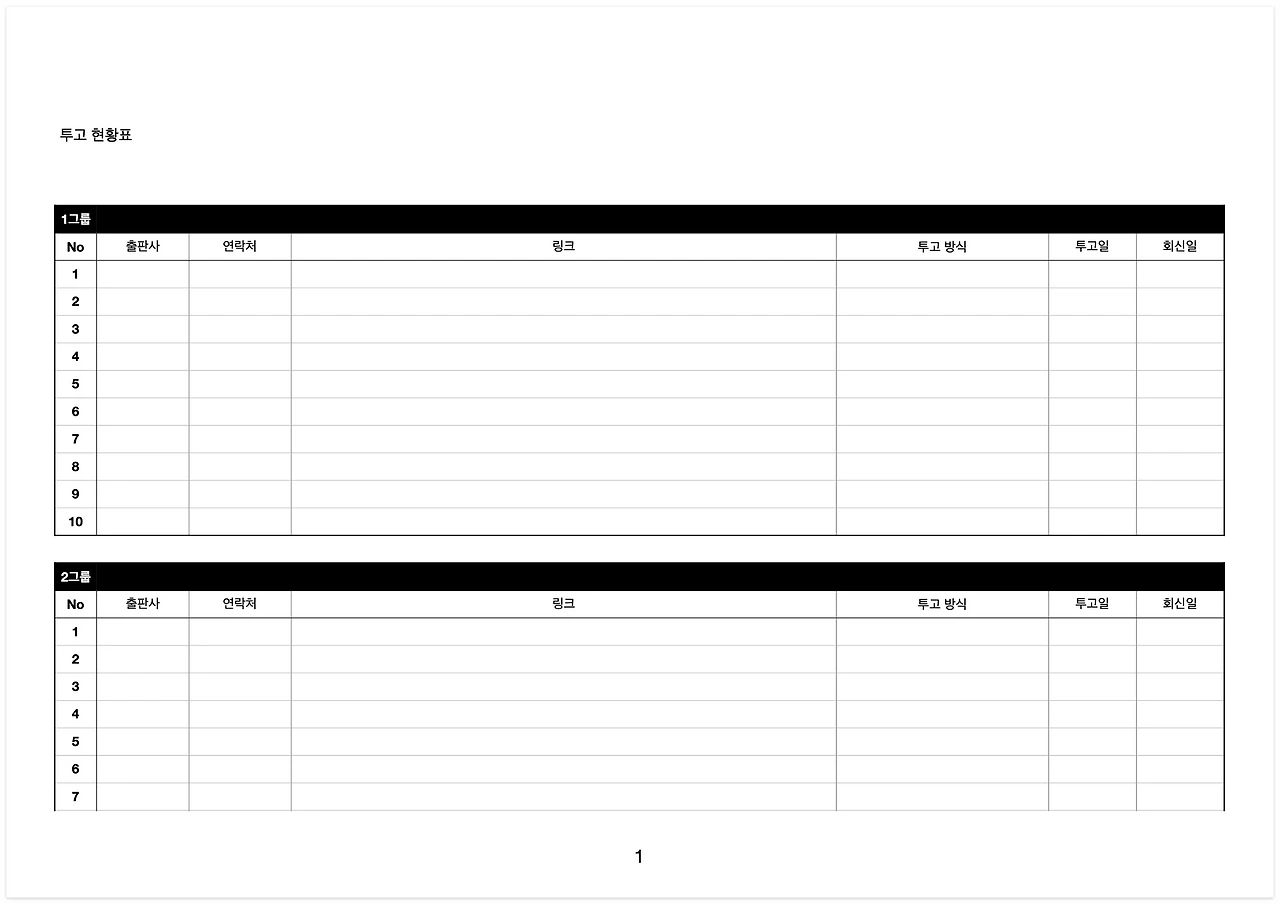 마침내 6그룹으로 나누는 작업이 끝났습니다. 그리고 이를 입력할 '투고 현황표 양식'을 만들었습니다.