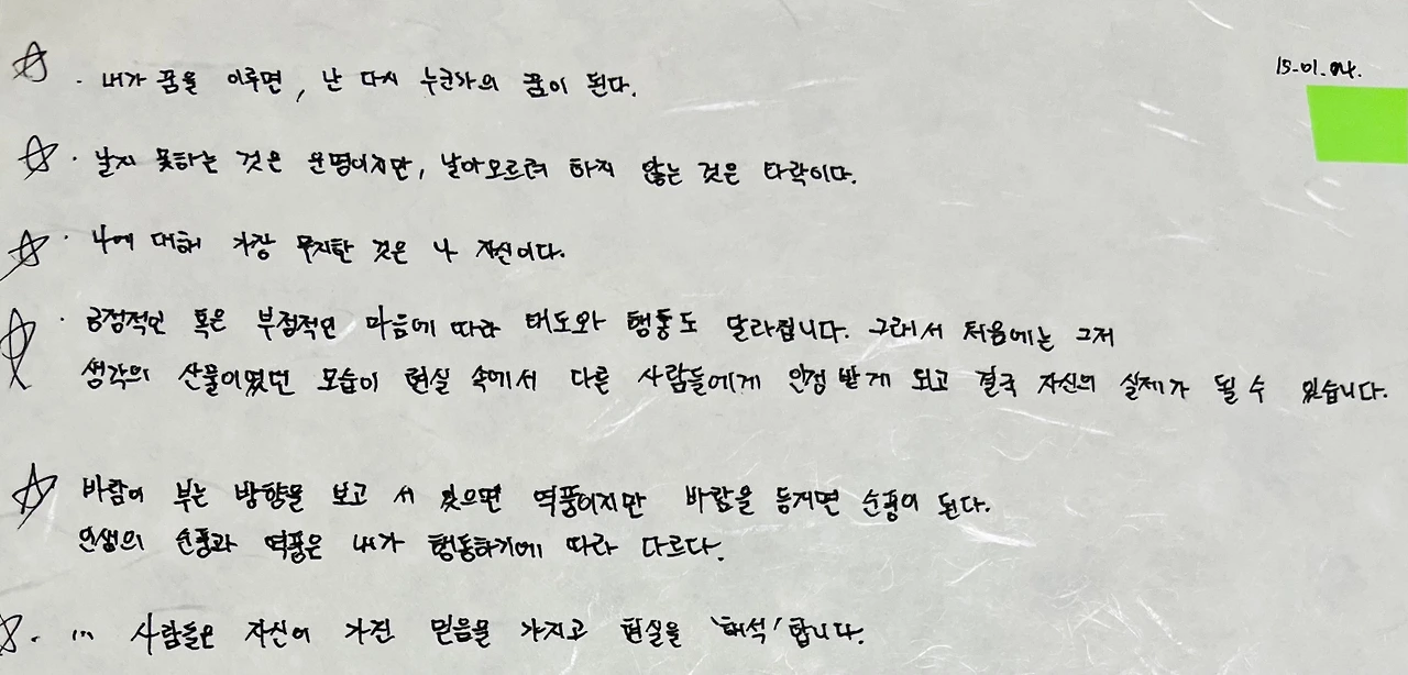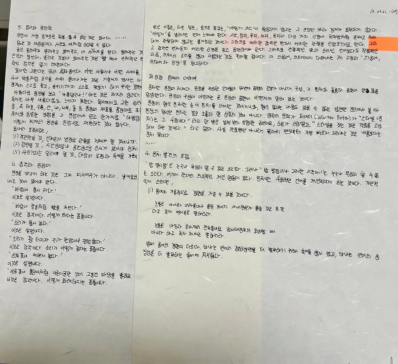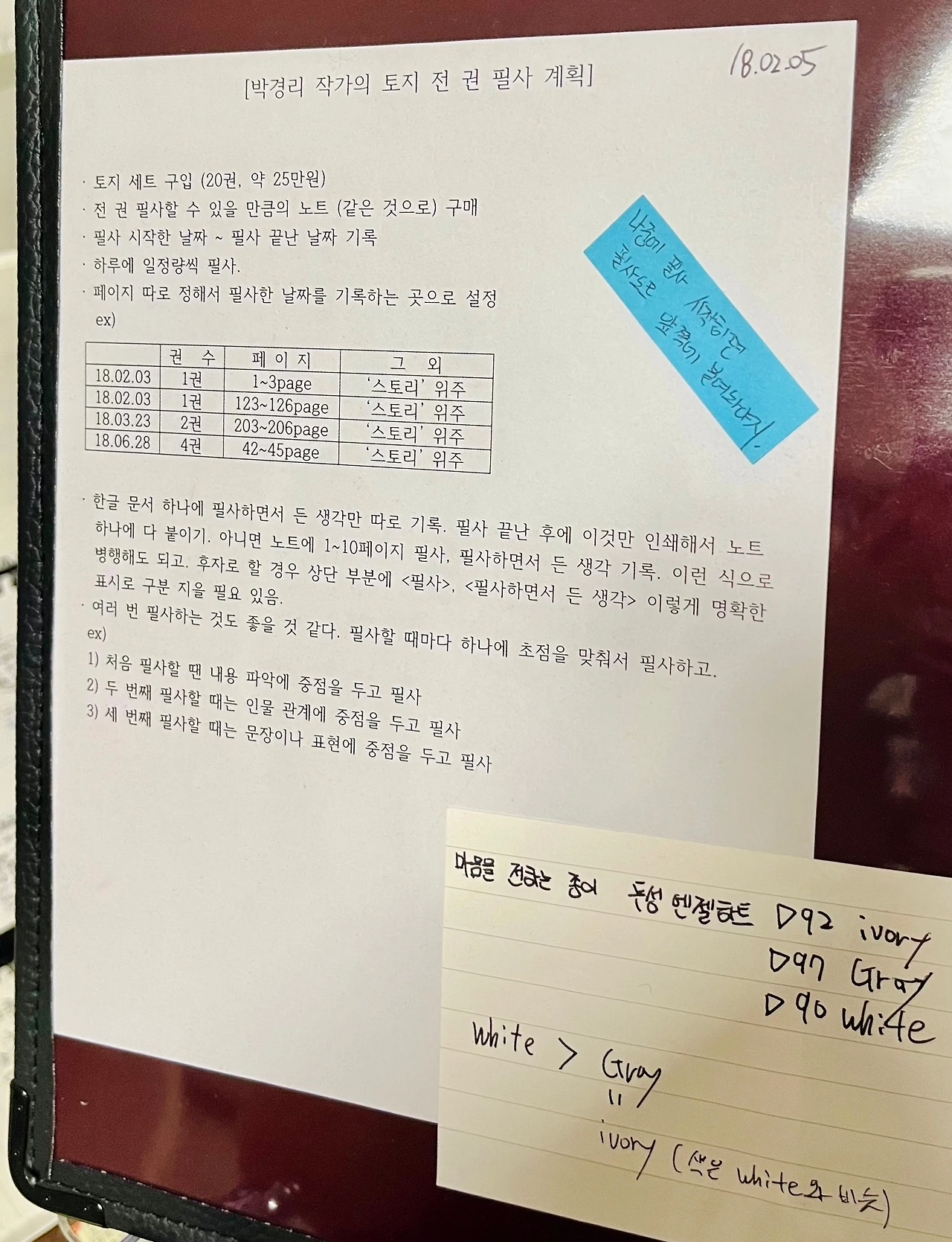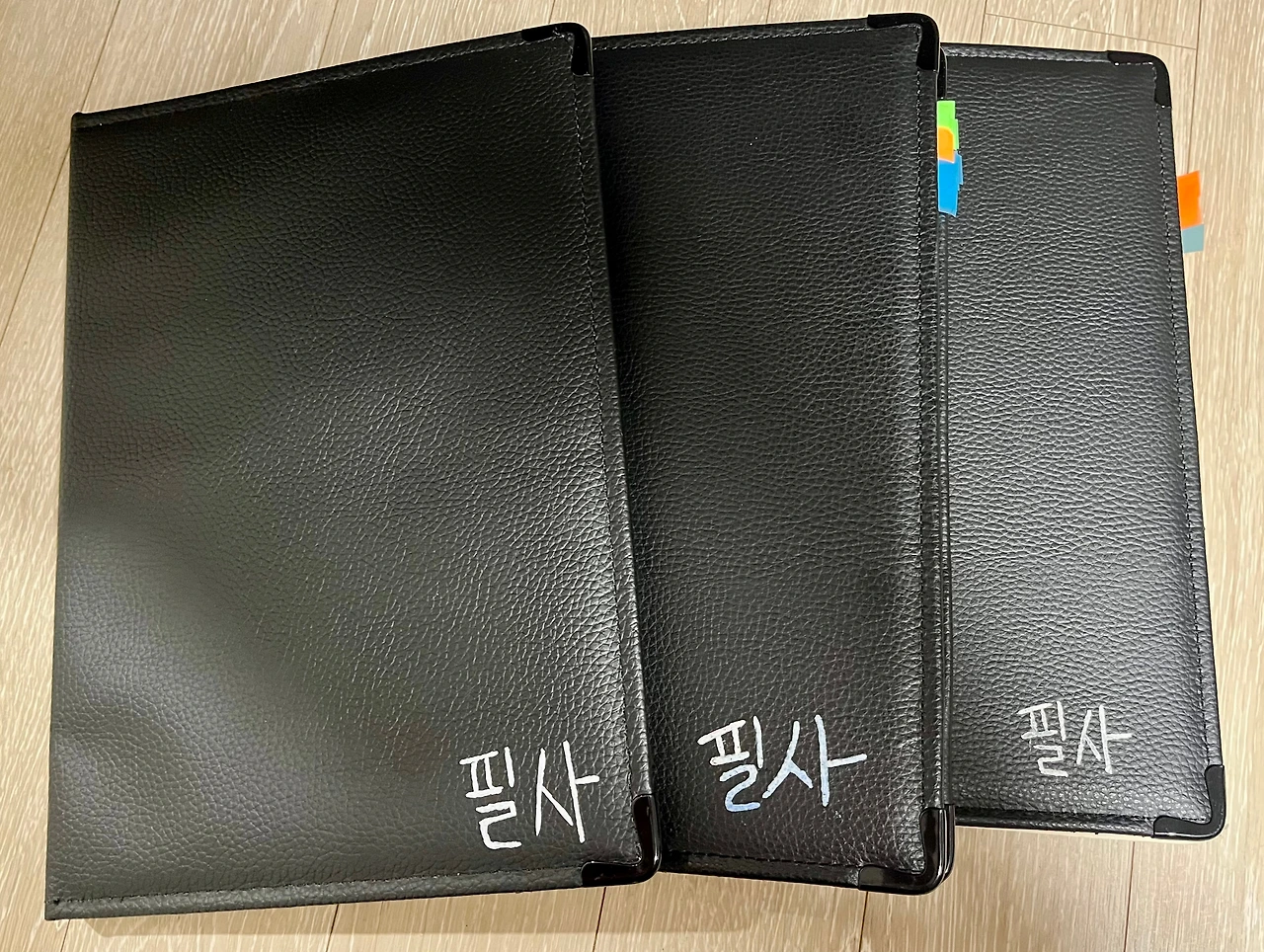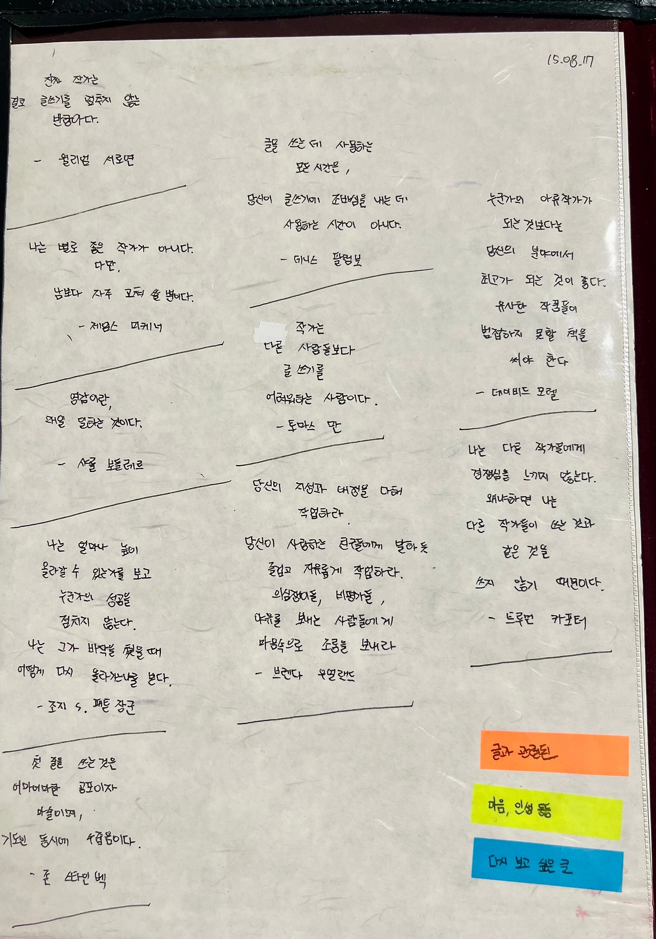 어쩐지 클립보드에 꽂혔습니다. A4 종이에 써서 클립보드에 보관하는 방식이죠. 전역한 직후라서 가능했겠지만, 수첩 13개에 있는 모든 글을 훑었습니다. 그러고 나서 다시 보고 싶은 글만 옮겨 적었습니다. 크게 나누면 에세이와 필사이죠. 그렇게 '필사 클립보드'에 종이가 쌓이기 시작했습니다.