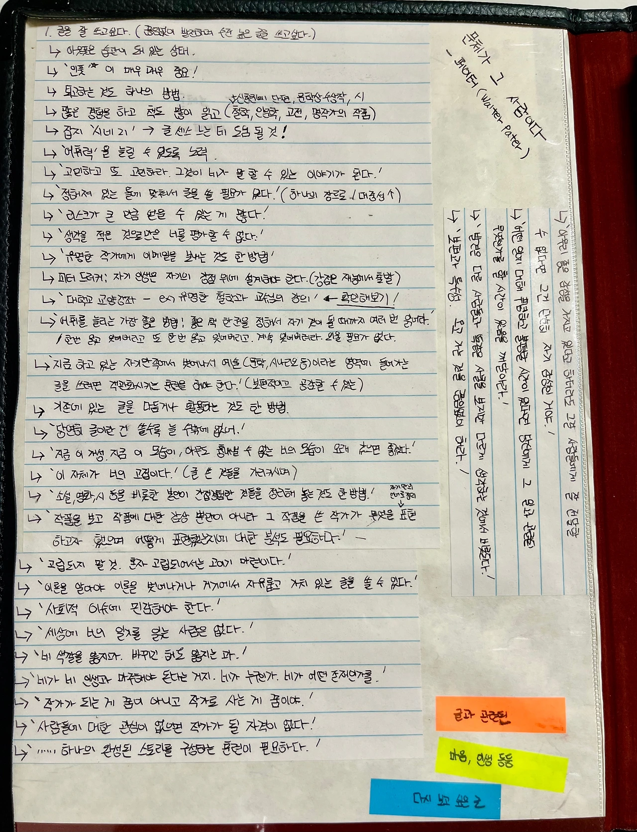아마도 100권 넘게 책을 읽었습니다. 관심 있는 분야라 읽고. 버티기 위해서 읽고. 그랬던 것 같습니다. 수첩에는 일기와 필사와 To Do List 같은 게 뒤섞였습니다. 지금은 들여다보지 않지만, 벌써 12~10년 가까이 지난 흔적이지만, 나름의 추억이 깃들어 보관하는 중입니다.