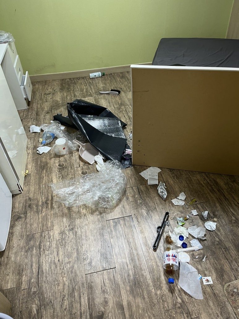 도착하면 장화로 갈아 신고 트렁크에서 청소 도구를 챙겨서 방에 들어간다. 쓰레기를 치우고 빗자루로 방을 쓸고 화장실에 물을 뿌린다. 레인지 후드를 빼서 오븐 클리너를 바른다. 곰팡이가 심한 곳이 있으면 락스를 바른다. 침대를 밀고 빗자루로 쓴 뒤에 창틀을 청소하고, 에어컨 위에 쌓인 먼지를 제거하고, 에어컨 필터를 빼서 청소하고, 책상이나 옷장 따위를 닦고, TV를 닦는다. 몰딩을 청소하고 오븐 클리너 바른 걸레를 밀대에 붙인 뒤에 침대가 있었던 자리를 닦는다. 이때 잘 안 닦이는 부분이 있으면 발로 수세미를 문질러 해결한다. 그다음 스퀴지로 물기를 모아 걸레로 훔치고, 마른 걸레를 밀대에 붙여서 또 한 번 닦는다. 마지막으로 마른 걸레를 들고 가서 놓친 부분이 없는지 확인한다. 이 과정이 다 끝나면 침대를 원래 있었던 위치로 옮긴다. 전자레인지, 냉장고(심하게 더러우면 선반을 다 꺼내서 닦는다), 중문 들을 깨끗이 만든 다음에 보일러실과 화장실을 청소한다. 보통 주방을 마무리하기 전에 방을 닦고 나온다(밀대로 닦고 스퀴지로 모아서 걸레로 훔치고 또 한 번 밀대로 닦는 식) 주방을 청소할 땐 서비스로 세탁기에 있는 먼지를 제거한다. 다 끝나고 나올 땐 '청소 완료. 신발 벗고 들어가세요.'가 적힌 종이를 현관에 둔다.