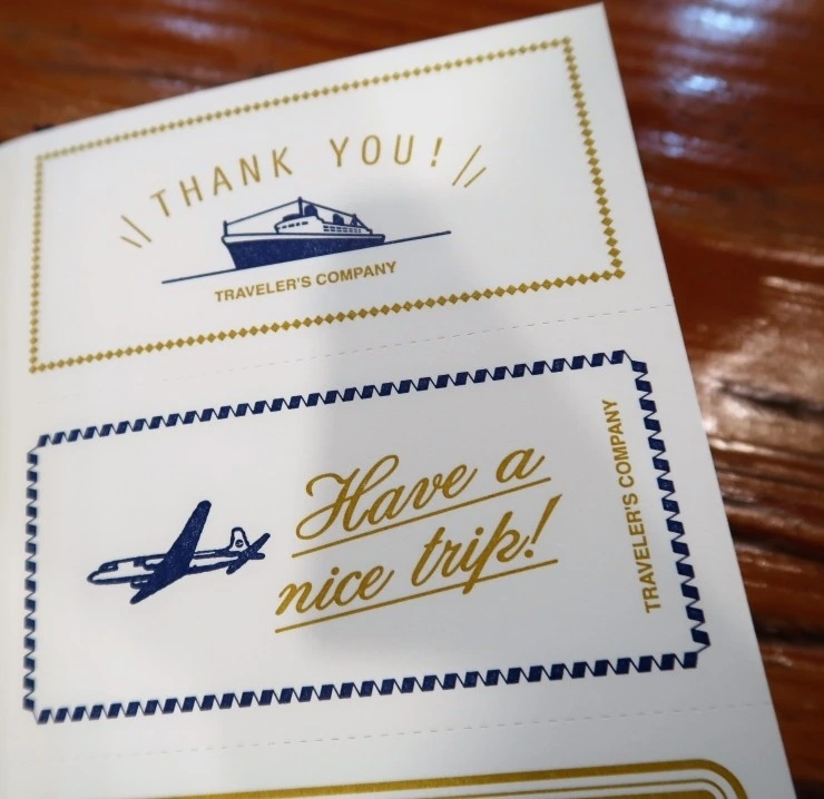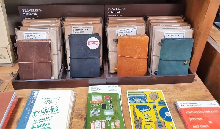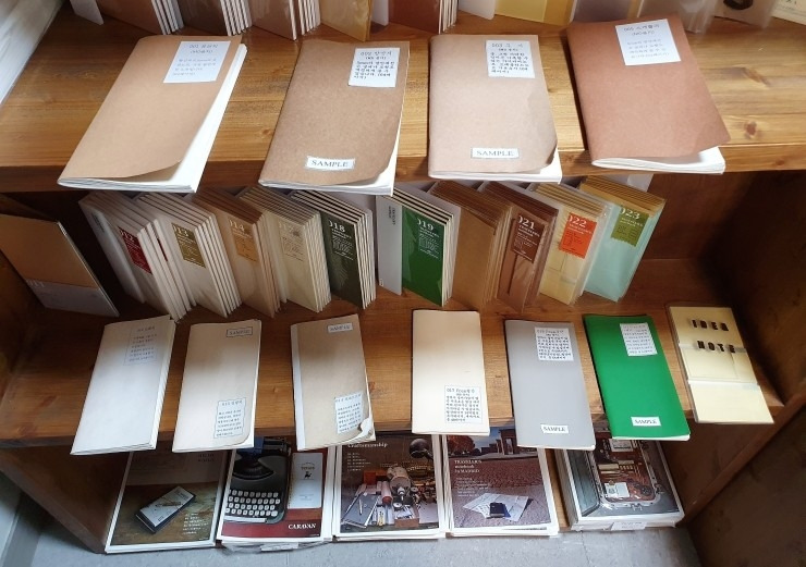 미도리 하면 떠오르는 디자인입니다. 미도리에서 판매하는 모든 공책에는 자체 공장에서 만든 종이가 쓰입니다. 미도리에서 유명한 제품이 두 가지 있는데, 하나는 만년필을 쓰는 사람들이 많이 찾는 고급 종이이고, 나머지 하나는 트래블러스 노트 브랜드의 공책입니다. 사실 미도리나 트래블러스 노트나 이름만 다를 뿐 똑같은 업체이죠. 트래블러스 노트를 부각하기 위해서 이름만 달리했습니다. 직원분이 알려 주신 내용들입니다.