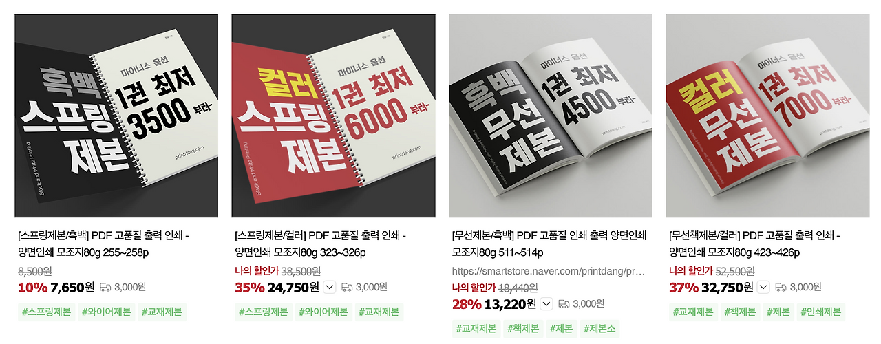 저는 이 중에서 흑백 스프링 제본과 흑백 무선 제본과 컬러 무선 제본을 이용했습니다.