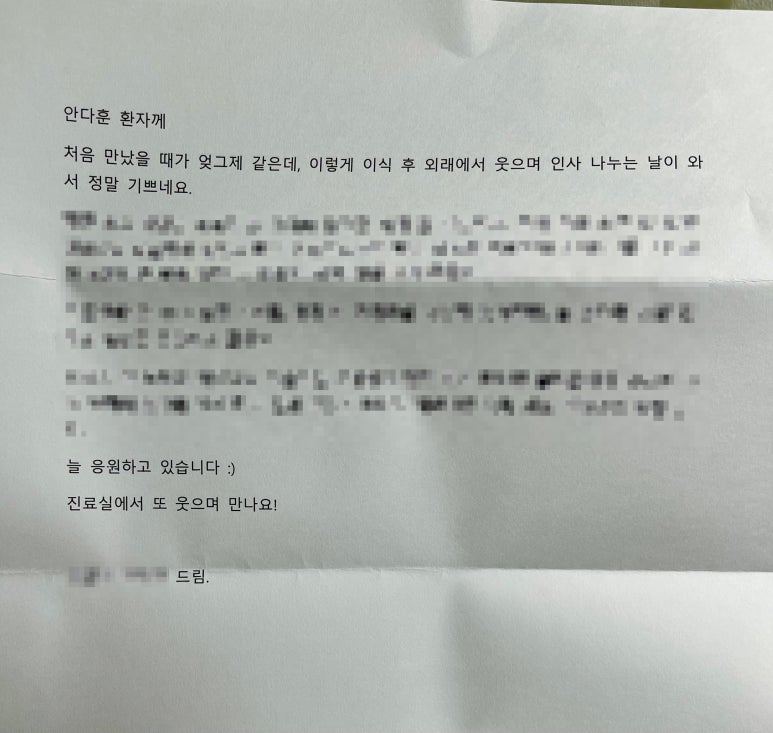 위 글을 인쇄해서 클리어 파일 맨 앞에 넣고 그 뒤에는 항암 생활을 다룬 글 일부를 넣었습니다. 어떤 글을 썼는지 보여 드릴 필요를 느꼈고, 선생님께서 참고하시는 데 도움 되기를 바라는 마음도 있었죠. 외래 진료 때 간단히 설명하고 클리어 파일과 함께 간식 선물을 드렸습니다. 선생님께서는 흔쾌히 허락해 주셨고, 다음 외래 진료 때 작성한 글을 프린트해서 주셨습니다.