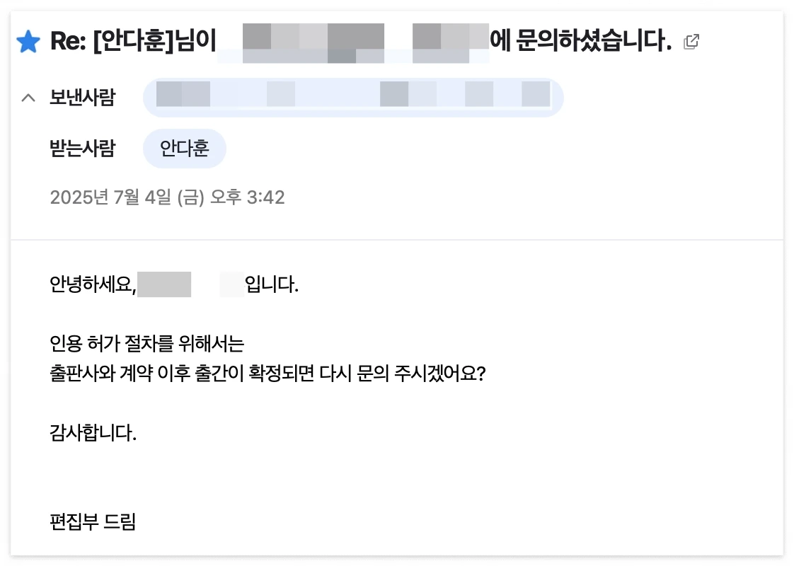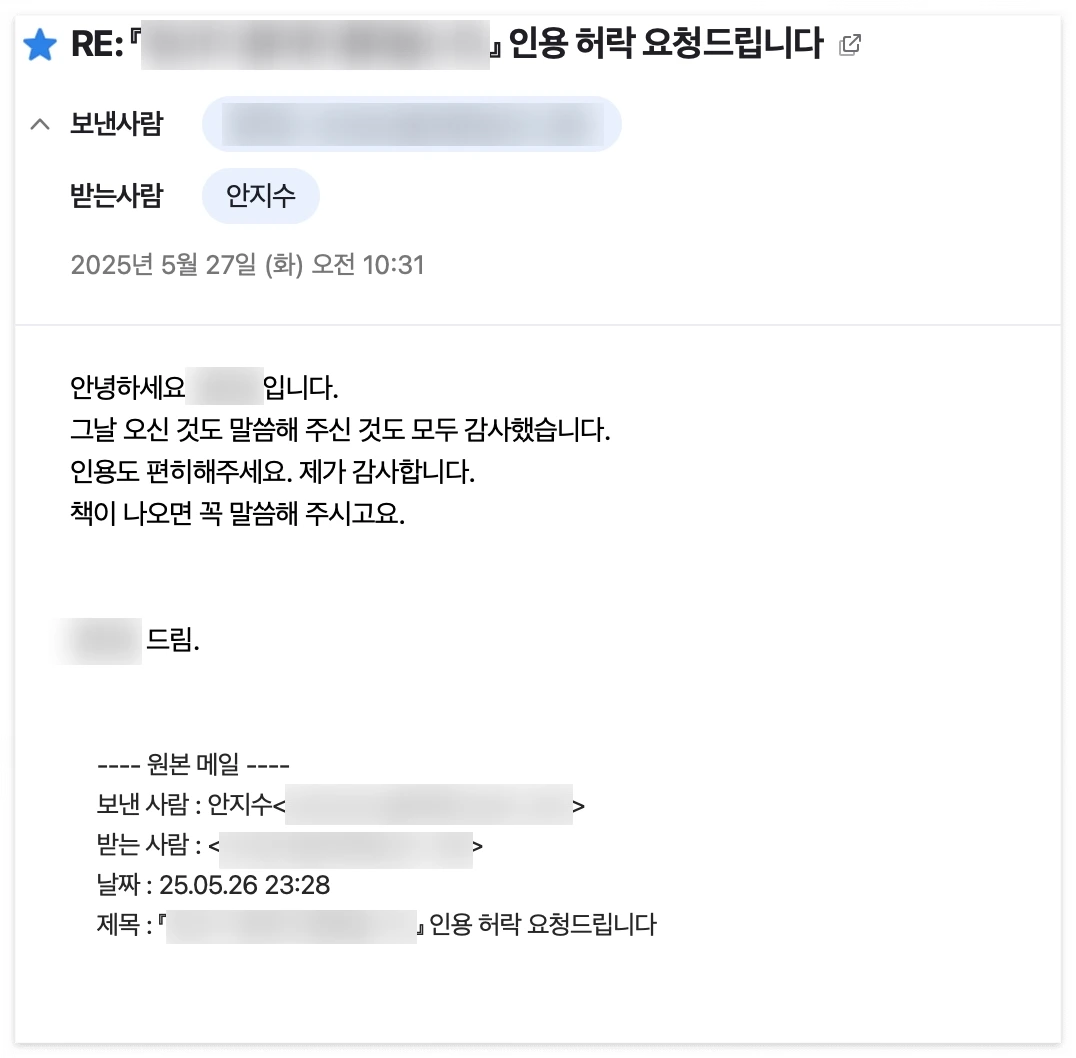우선 첫 번째 답장 내용입니다. 저자분과 강연에서 만난 적이 있기에 출판사가 아닌 저자분께 직접 보냈습니다. 다행히도 흔쾌히 허락해 주셨습니다.