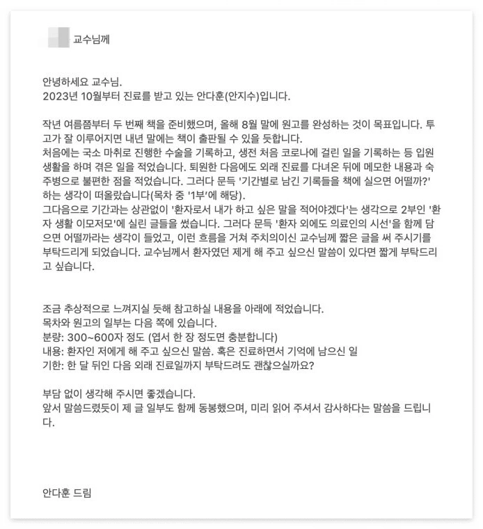 원고의 1부에는 백혈병 관련 내용을 담았습니다. 입원하게 된 계기부터 퇴원 이후의 일상을 골고루 다루려고 했죠. 이와 관련해서 '주치의 선생님께 글을 써 달라고 부탁드리면 어떨까' 하는 생각이 문득 들었습니다. 퇴원 후에도 짧으면 일주일에 한 번, 길면 오 주에 한 번 외래 진료 때마다 뵙는 주치의 선생님. 여전히 5주의 벽을 넘지 못하고 꾸준히 봬야 하는 선생님. 사실 대면했을 땐 교수님이라고 부르긴 합니다. 아무튼 일종의 원고 청탁이라 해야 할까요. 우선 청탁을 요청하는 글부터 작성했습니다.
