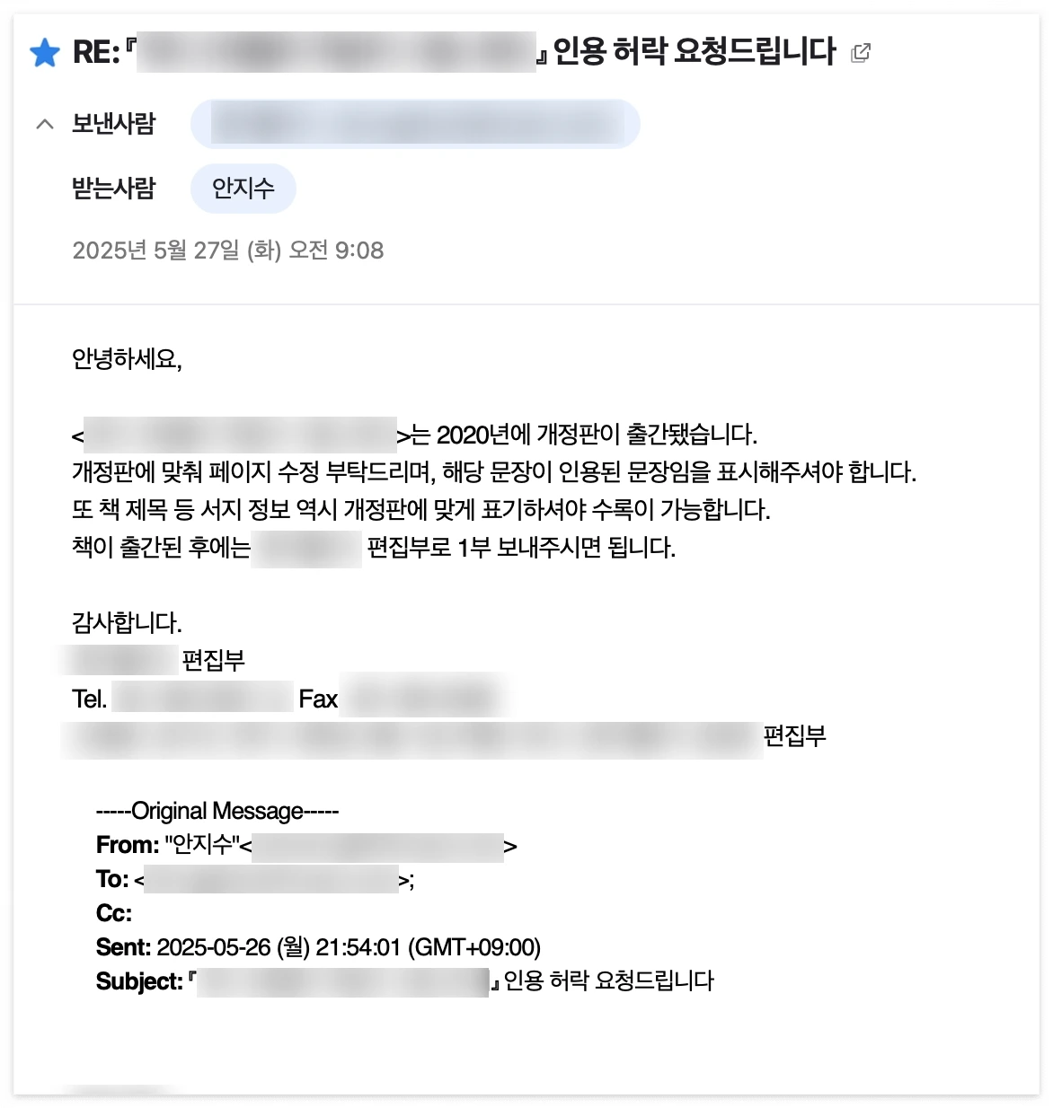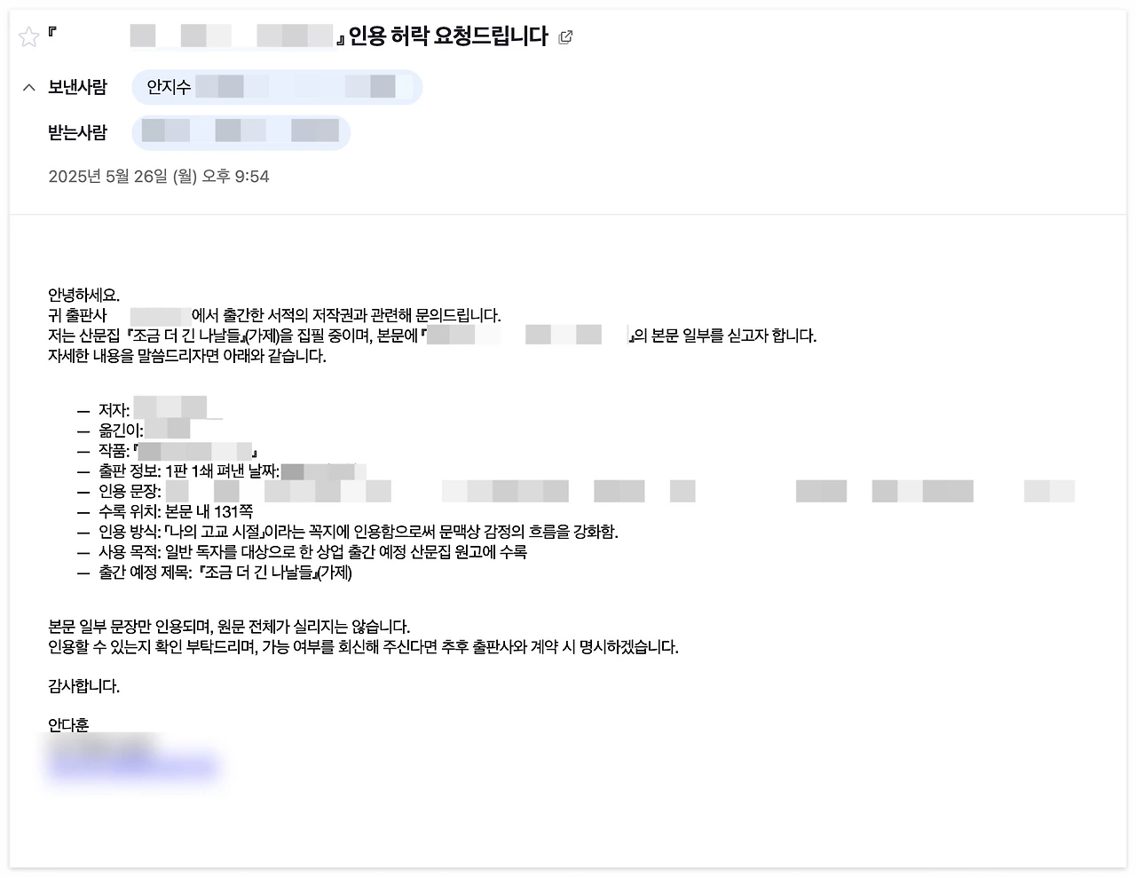 우선 위 사진과 같이 양식을 만들었습니다. 인용한 책마다 정보를 달리해서 적으면 되도록 한 것이죠. 실제로 보낸 메일을 보여 드리자면 아래와 같습니다.