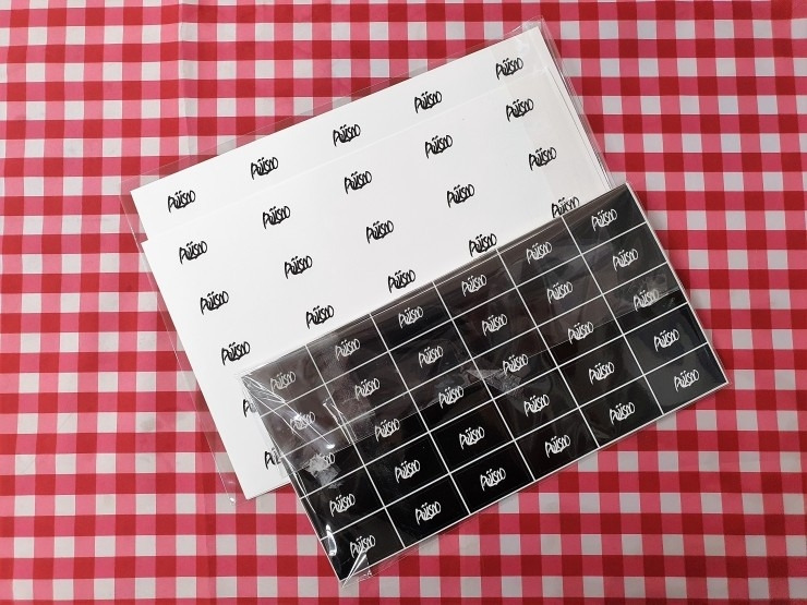 사이즈에 따라 두 종류로 나뉘며(40x23mm, 52x30mm) 공통 사항은 [사각반칼 스티커, 유포지, 49부, 묶음 재단] 입니다.