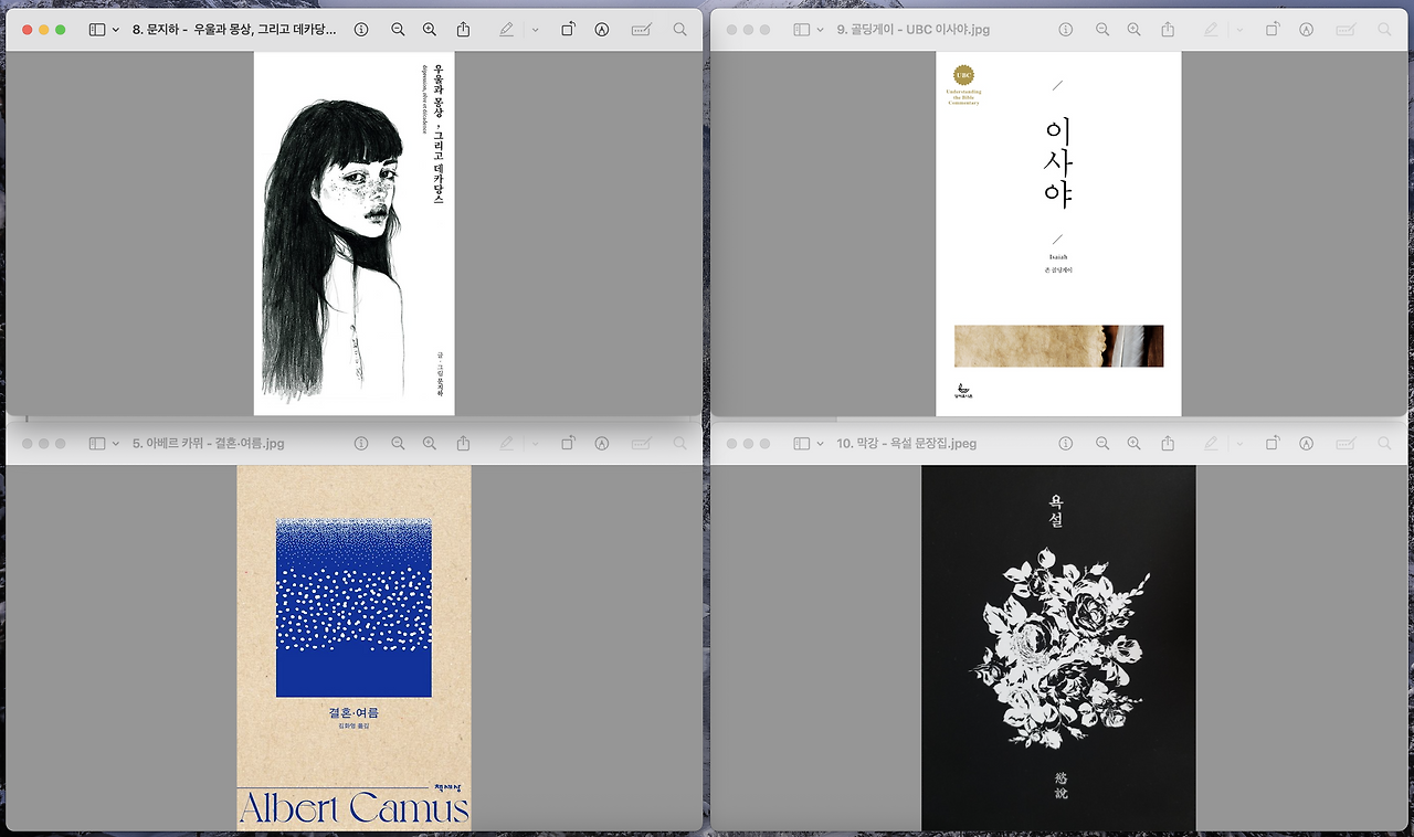 (왼쪽 위부터 시계 방향으로) 문지하 작가의 《우울과 몽상, 그리고 데카당스》, 존 골딩게이 작가의 《UBC 이사야》, 막강 작가의 《욕설 문장집》, 아베르 카뷔 작가의 《결혼·여름》입니다.