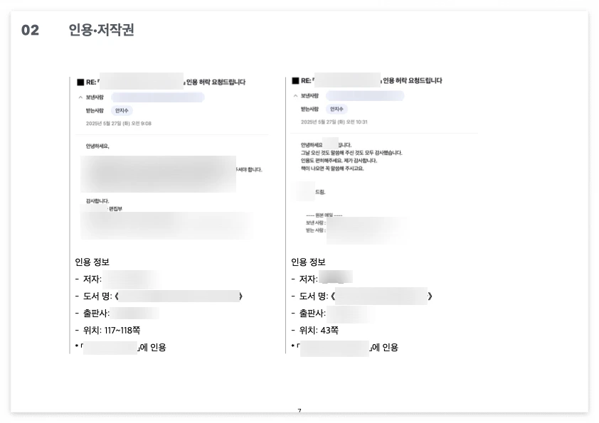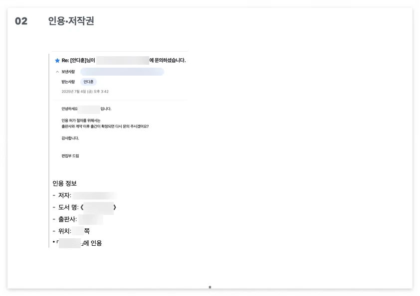 PPT 초반에는 원고와 관련해 가장 중요한 내용(편집 관련 메모)을 배치했습니다. 그다음으로 저작권 관련 내용을 담는 게 적절해 보였죠. 위쪽에는 회신 메일을 캡처해서 넣고, 아래쪽에는 인용 정보를 요약해서 적었습니다.