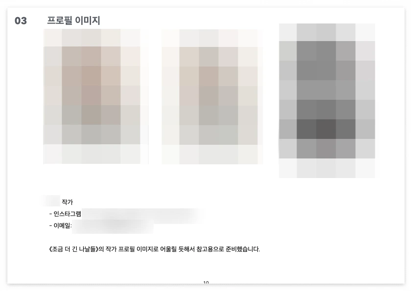 '만약에 프로필 이미지를 싣는다면 어떤 형태가 좋을까'라는 생각에서 비롯된 챕터입니다. 처음엔 사진으로 넣으려 했습니다. 흑백 사진과 컬러 사진 중 어떤 게 나을까, 상반신 위주로 찍는 게 좋을까 등을 고민하며 레퍼런스를 찾았습니다. 그러다 그림이 나을 듯해 다시 제가 원하는 레퍼런스를 구했습니다. 세 개로 추린 다음에 올렸고, 작가님 성함과 인스타그램과 이메일 주소를 아래에 함께 적었습니다.