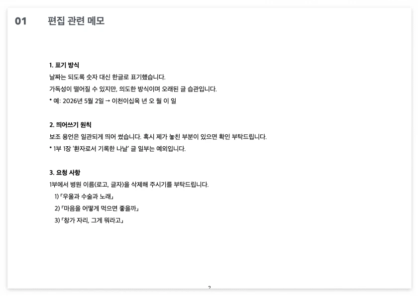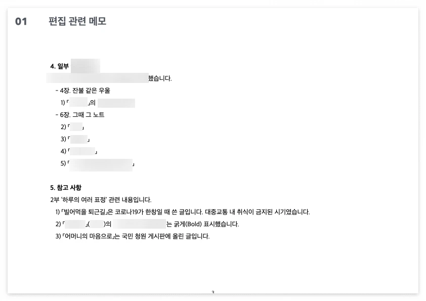 '왜?'라는 물음이 해소될 수 있고, 원고의 특성을 더 잘 파악할 수 있고, 불필요한 과정을 생략할 수 있고, 편집 과정에서 반영하실 부분도 있지 않을까. 하는 생각을 했습니다.
