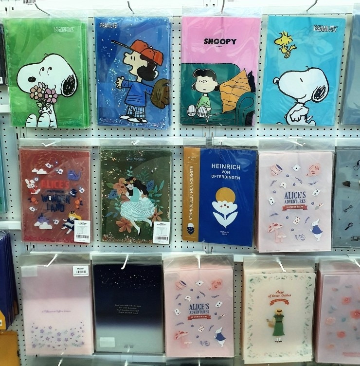 알라딘 중고서점의 주된 감성입니다. 만화 캐릭터나 문학 작품을 가미한 게 대부분입니다. 다만 제가 캐릭터나 그림이 들어간 제품을 거의 안 쓸 뿐이죠. 선물할 때 들르면 괜찮지 않을까 싶습니다. (저 공책은 결국 몇 장 쓰다 말았습니다.)