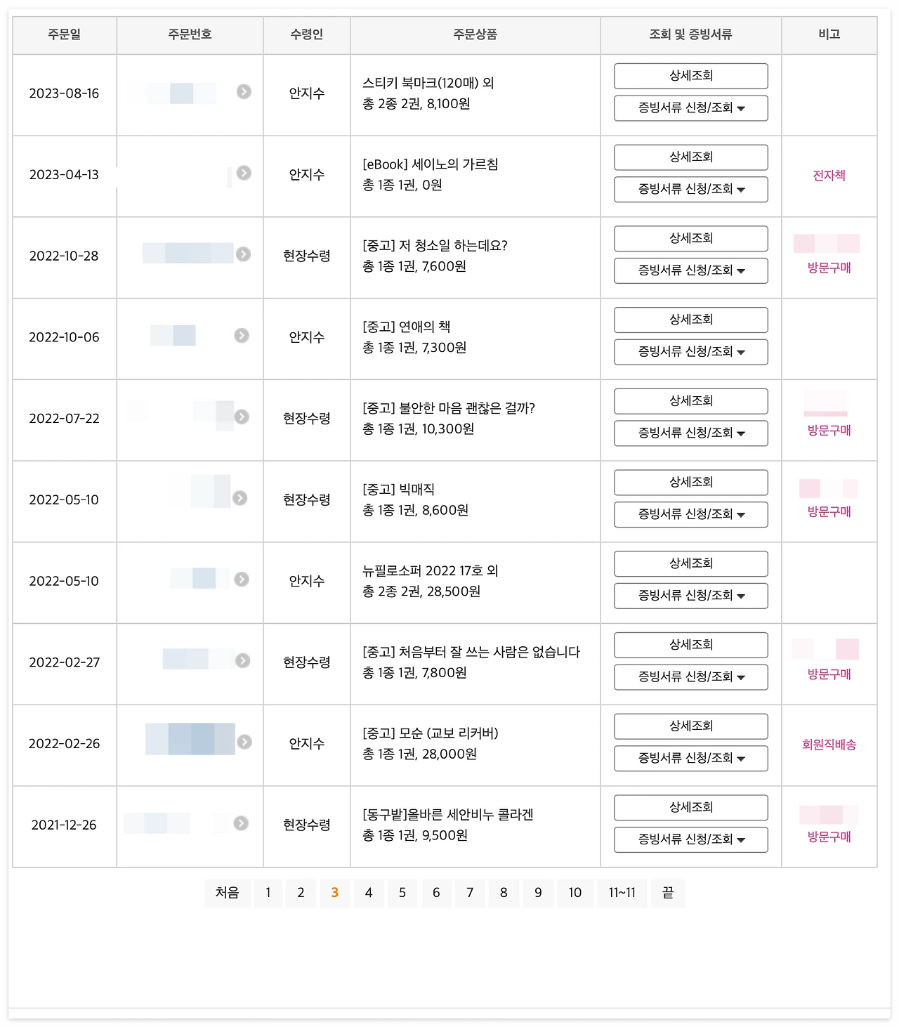 열한 쪽을 다 캡처하긴 너무 많은 듯해 일부만 가져왔습니다. 회원가입하고 이용한 건 십사 년째입니다. 적립 안 한 적이 꽤 되니, 실제로는 몇 쪽 더 나오겠네요.