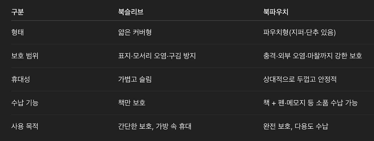 선물하기 괜찮아 보이는 북 슬리브입니다. 북 파우치와 뭐가 다른 건지 몰라서 ChatGPT한테 물어보니 이렇게 알려 주네요.