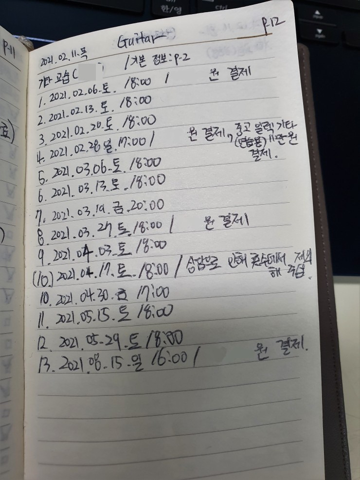 기타 레슨받는 날짜와 시각을 기록했습니다. 제가 하는 활동을 다 적는 편입니다.