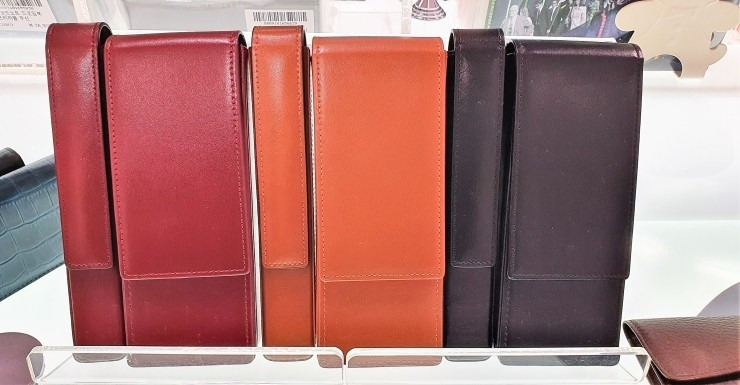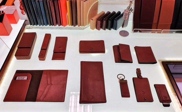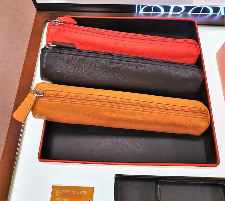 모아놓은 걸 보니 좀 부담스럽지만 하나씩 보면 괜찮습니다. 천장이 비치는 밝은 색 진열대에 둬서 진한 가죽 제품이 도드라집니다. 100%가 적당하다고 하면 130% 이상으로 부각돼서 부담스럽다고 해야 할까요. 디자인이나 전시 관련해서 아는 건 없지만, 따뜻한 느낌이든 차가운 느낌이든 중화할 수 있도록 진열대를 바꾸면 낫지 않을까 싶습니다.