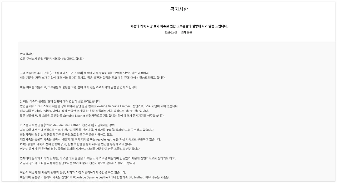 앞서 말씀드린 '가죽 사양 표기 이슈'입니다. 알면서 안 넣기 조금 그래서 함께 첨부했습니다.