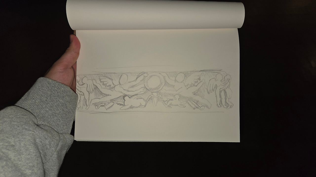 처음 5분은 전체 구도를 잡는 데 썼다. 수평으로 긴 직사각형 프레임 안에 인물들이 빼곡하게 들어차 있었는데, 눈으로 볼 때는 그냥 '복잡한 부조'였던 것이 선을 따라 그리기 시작하자 하나씩 분해되기 시작했다. 중앙의 원판을 중심으로 좌우가 거의 대칭이라는 것, 인물들의 비례가 성인이 아닌 유아에 가깝다는 것, 상단의 날개 달린 인물들과 하단의 엎드린 스핑크스 형상이 완전히 다른 동세를 가지고 있다는 것. 눈으로만 봤을 때는 하나도 보이지 않았던 것들이 연필 끝에서 드러났다.