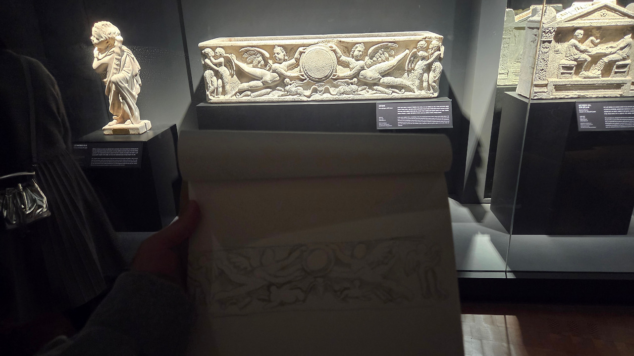 30분이 지나고 스케치를 마쳤을 때, 나는 이 석관 부조에 대해 설명문을 읽지 않고도 꽤 많은 것을 말할 수 있게 되어 있었다. 고부조가 깊게 파여 있어서 조명에 따라 그림자가 달라지는 것, 원판이 얼마나 돌출되어 있는지, 인물의 피부는 매끄럽게 연마되어 있는데 배경은 의도적으로 거칠게 남겨둔 것. 눈으로 훑었을 때는 전혀 보이지 않았던 것들이, 연필로 따라 그리면서 비로소 보이기 시작했다.