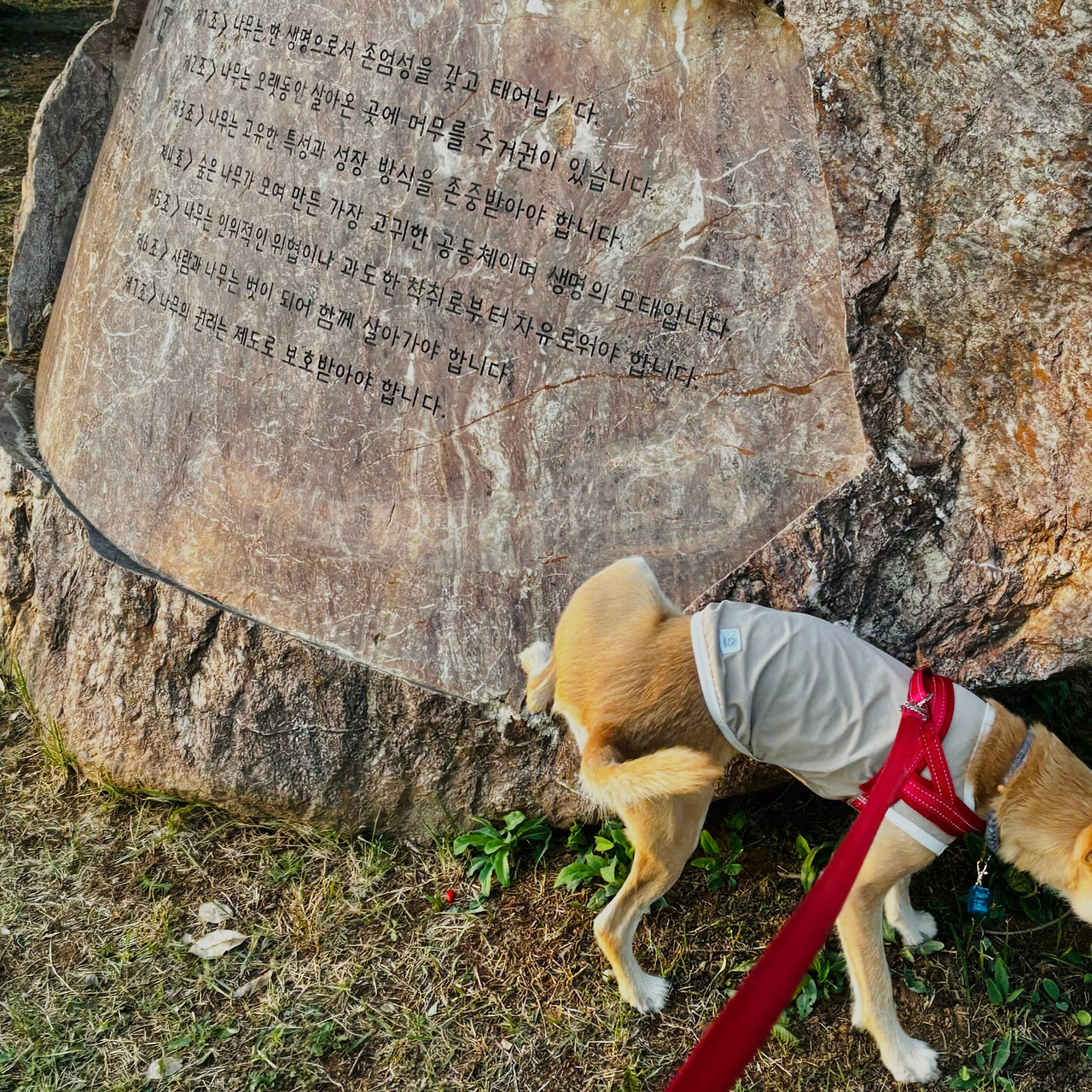 내가 사는 이 도시의 호수공원 한켠에는 커다란 바위 위에 나무에 대한 일종의 권리선언문이 새겨져 있다. 마치 '동물권'이라고 하여 같이 사는 반려견이나 반려묘도 하나의 존엄한 대상으로서 대하자는 그런 내용과 비슷한 취지인 것 같다. 임시보호 하는 개를 데리고 산책하던 도중, 이 선언문 바위를 보고선 난 '어린아이들이 이 선언문을 보면서 나무를 더 아끼고 생각하진 않을까' 하는 순진한 생각이 문득 들었다.