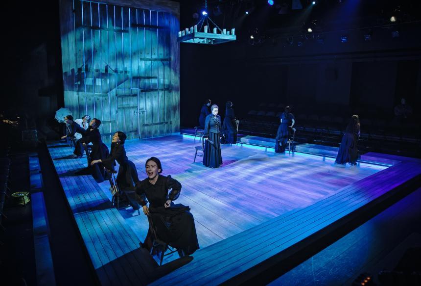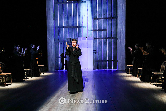 #베르나르다 알바의 집에서 여성들에게 주어진 결말은 단 두 가지 뿐이다. 검은 옷을 입은 죄수가 되거나, 흰 옷을 입은 미치광이 혹은 시체가 되거나. '행복해야만 하는' 앙구스티아스나 '유일하게 아버지를 사랑한' 막달레나, '소문 하나 없는' 아멜리아, '남자들이 조롱하고 침을 뱉는' 마르티리오는 베르나르다와 함께 시대의 감옥에 갇혀 죄수로 살아가는, 검은 옷을 입은 슬프고 평범한 죄수들이다. 자기 어머니를 창녀라고 부른 남자를 위해 푹푹 찌는 안달루시아의 무더위 속에서도 긴팔의 검은 드레스를 입고 수를 놓는 죄수들. 하지만 탈옥은 용납되지 않는 시대였고 남자를 원해, 자유롭게 살고 싶어, 본능을 따라 살 거야. 흰 옷을 입고 그렇게 외친 마리아 호세파와 아델라는 미치거나 죽어버렸다. 얼마나 끔찍한 결말인가, 자유를 추구하고 본능을 쫓은 여성은 미친 년 취급을 당하며 뭇매를 맞거나 감금되고, 혹은 손가락질과 경멸, 혐오와 무시에 유린당하며 목숨을 끊는다. 이 끔찍한 학대들이 수없이 많은 여성들의 삶에 미시사로서 존재하고 있단 걸 우린 알고 있다. 그리고 <베르나르다 알바>는 우리가 알고 있던, 그 박제된 역사들을 무대 위에 펼쳐놓고 눈 앞에 참혹하게 들이댄다. 박제된 여성혐오의 역사와 고난의 서사, 인간으로서 본능을 억압당하고 가축처럼 감금당했던-흡사 발정난 수컷말 때문에 마굿간 안에 갇혀야했던 암컷말들처럼-여성들의 노래와 외침은 세련되고 스타일리시한 이 극을 날 것의 피가 뚝뚝 떨어지는 섬뜩한 칼춤처럼 느끼게 만든다. 이런 서사를 단순히 한 남자를 둔 자매간의 질투가 불러온 참극 정도로 표현하는 건 극에 대한, 그리고 참혹한 역사를 거쳐 생존해 온 여성들을 향한 무례이고 또 실례다.