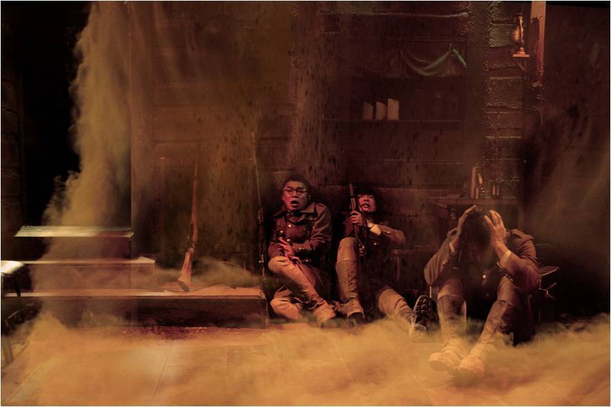 <아가멤논>의 노래하는 저격수와 아돌프 가 그랬고 <모르가나>의 아더왕과 원탁의 기사들이 그랬듯, 주인공에게 기대하는 생존 서사가 힘을 발휘한다면 참호 속의 유령들은 해피엔딩으로 끝나는 극 속에서 처음과 같이 영원히-아멘-웃으며 벙커를 떠나는 병사들을 볼 수 있을 거란 기대를 희미하게나마 걸어본다. 그러나 70분의 시간 동안 우리가 품었던 그 희미한 기대는 점점 휘발되고 빛이 바래 끝끝내 절망에 뒤덮이고 병사들은 공포를 끝내는 가장 손쉬운 방법으로 도망치게 된다. 죽음, 혹은 광기로. 좌절과 절규에 몸부림치는 병사들의 비통함은 군번줄 부딪히는 소리와 함께 참호 안에 울려퍼진다. 그리고 누군가 무대의 바닥, 참호에 드러누워 대자로 죽어나간 뒤에야 우리는 맥베스의 그 유명한 독백을 떠올리게 되는 것이다. 그렇다, "언젠가는 죽을 목숨이었다".