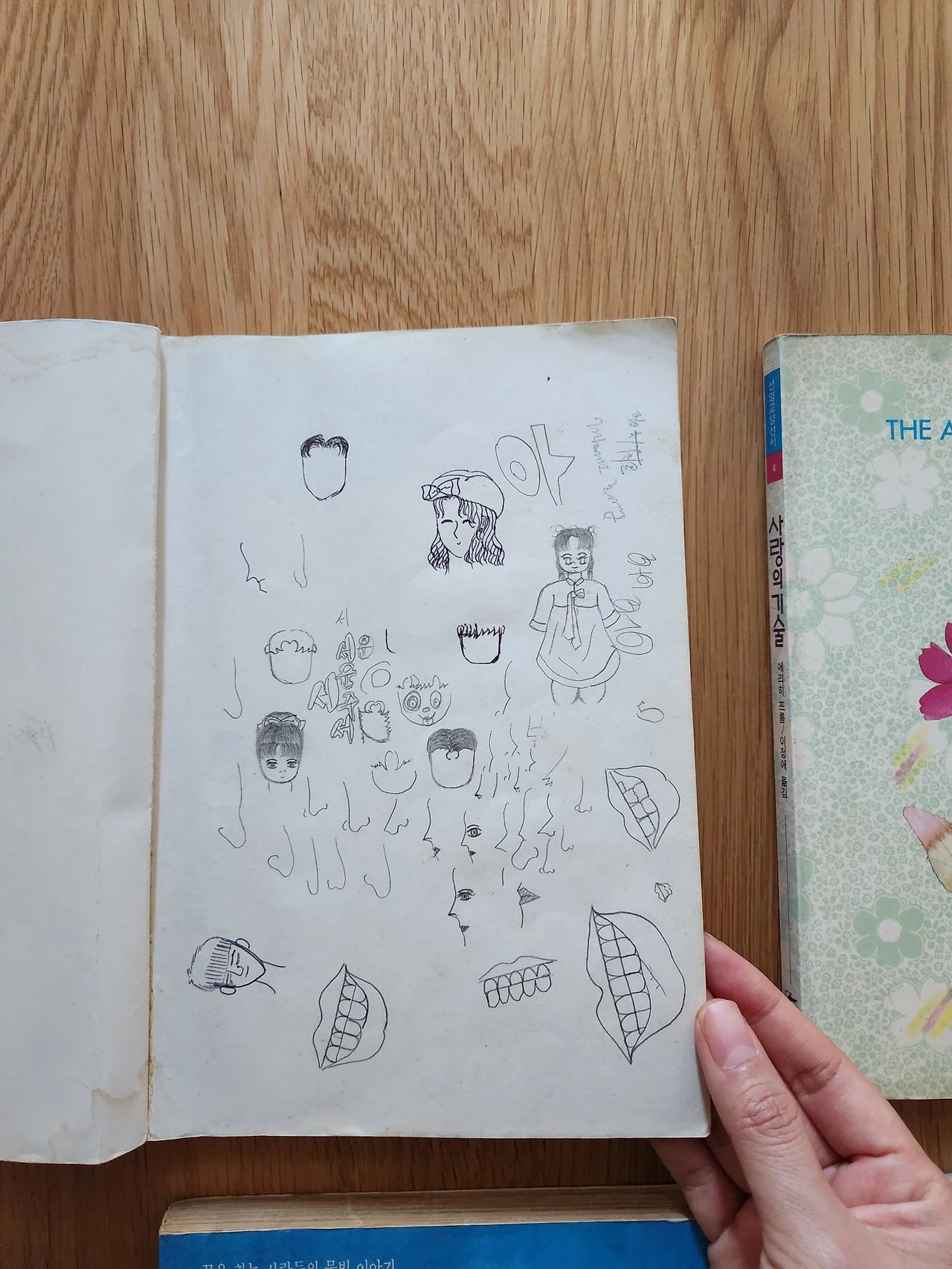 위에서 아래 순으로_벌렁코 할아버지, 사랑의 기술, 호텔 아프리카, 나의 라임오렌지나무. 서가에서 가장 오래된 책을 추려 보았다. @류예지 출처를 알 수 없는 낙서들이 빼곡한 <벌렁코 할아버지> 속지. 에리히 프롬의 <사랑의 기술>에 꽂혀 있던 이십 년 가까이 된 친구의 손편지. @류예지
