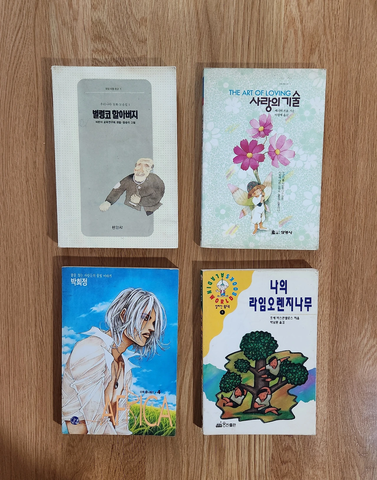 앞서 언급했듯 새책을 좋아하지만, 재영 책수선의 활동을 살피며 묵묵히 서가를 지켜준, 내 기준 가장 오래된 책 네 권을 꺼내왔다. 바로 너무도 사랑해마지 않는 만화가 박희정의 <호텔 아프리카> 4, 에리히 프롬의 <사랑의 기술>, 어린이 교육 연구회에서 엮은 <벌렁코 할아버지>, 호세 바스콘셀로스의